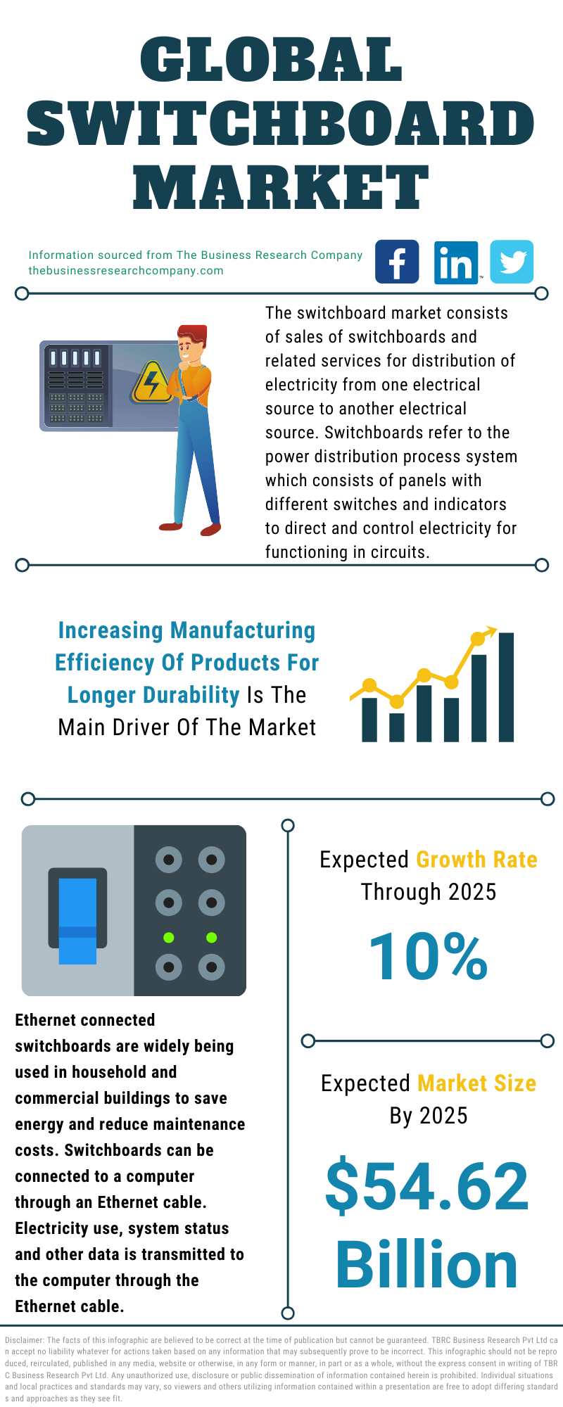 The switchboard market consists of sales of switchboards and related services for distribution of electricity from one electrical source to another electrical source. Switchboards refer to the power distribution process system which consists of panels with different switches and indicators to direct and control electricity for functioning in circuits.