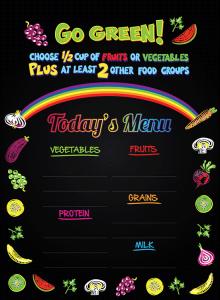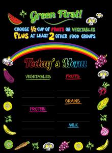 Vegetables and fruits are prominently displayed at the top of the menu, with proteins and grains positioned below to encourage prioritization of greens.