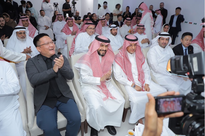 Testigo: Excmo. Sr. Khalid Al-Falih, Ministro de Inversiones (en el centro), Excmo. Ing. Mansour Bin Hilal Al Mushaiti, Viceministro de Medio Ambiente, Agua y Agricultura (primero desde la derecha), y el Dr. Yin Ye, Sr. Ma Zhe (primero desde la izquierda)