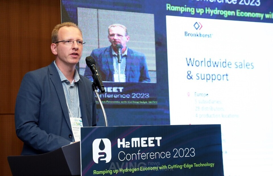 Peter Brauwer, the market developer of renewable energy at Brokhorst, speaking on Netherlands Day at KINTEX on the morning of the 13th | Photo by H2 MEET Organizing Committee