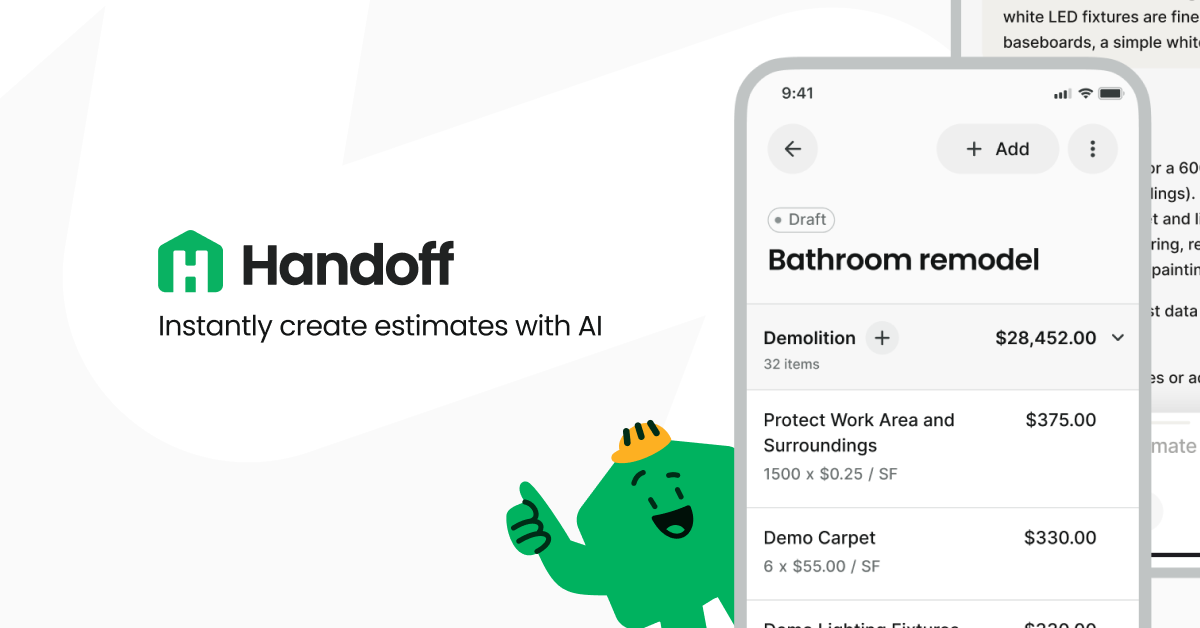 Using generative AI technology and real-time, localized construction databases, Handoff provides remodelers with a fast and accurate way to create construction cost estimates in seconds. Over 40K contractors have used Handoff to create instant construction estimates and automate their business operations with AI. Founded in 2019, Handoff’s parent company, 1build, has raised over $25M in funding from renowned investors and construction leaders like Initialized, Greycroft, Y Combinator, and Masco Ventures.