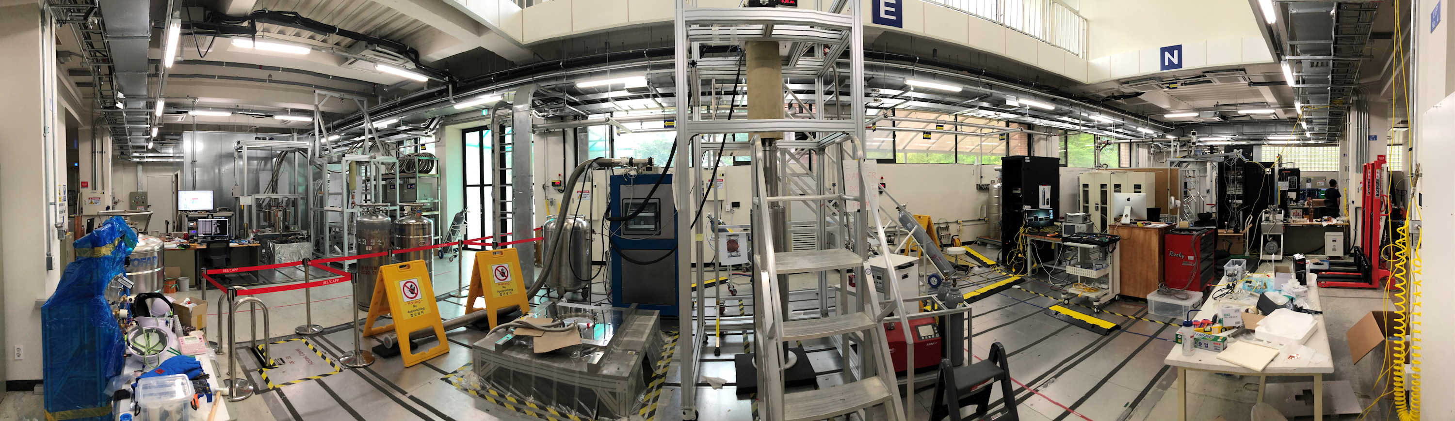 Fig. 3: The CAPP experimental hall allows multiple dark matter search experiments to be installed and operate at the same time. The laboratory includes seven low vibration pads for parallel experimental setups, as well as several refrigerators and superco