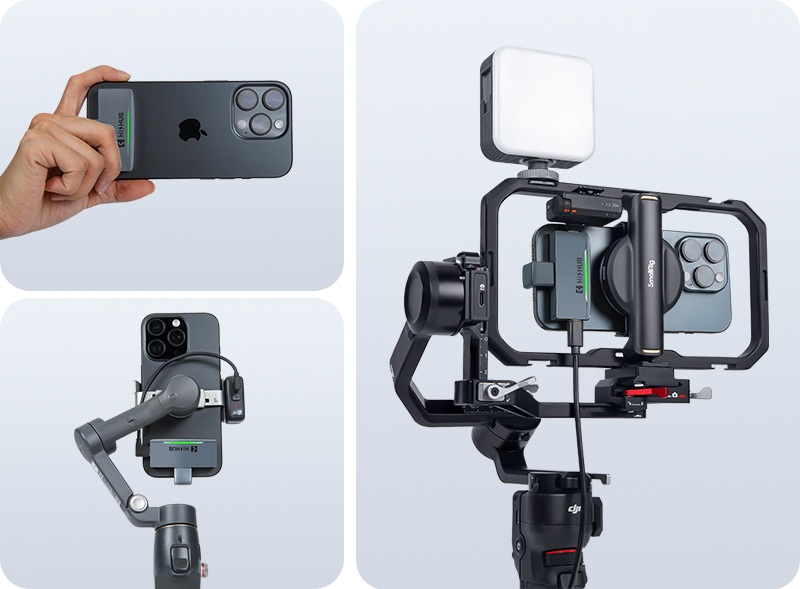 HISHUB is designed to work seamlessly with popular smartphone cages and gimbal systems, without blocking key mounting points or limiting movement.