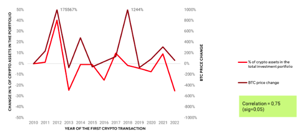 How much of one’s portfolio is allocated to crypto is correlated to the BTC price change in the year when one enters the market. Those investors who conducted their first crypto transaction during the bull market are more prone to increase the share of crypto in the overall portfolio.