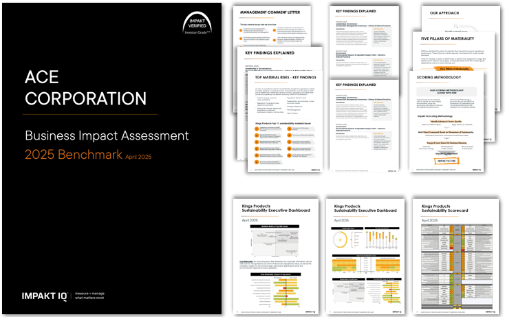 As global regulations tighten and sustainability becomes a defining factor of corporate value, companies are under increasing pressure to manage the “Other 70%”—the intangible assets that now make up the majority of enterprise value. Impakt IQ is the first solution to provide a standardized, auditable framework that links sustainability performance, operations and financial outcomes, helping companies mitigate risk, unlock value, and meet rising stakeholder expectations.
