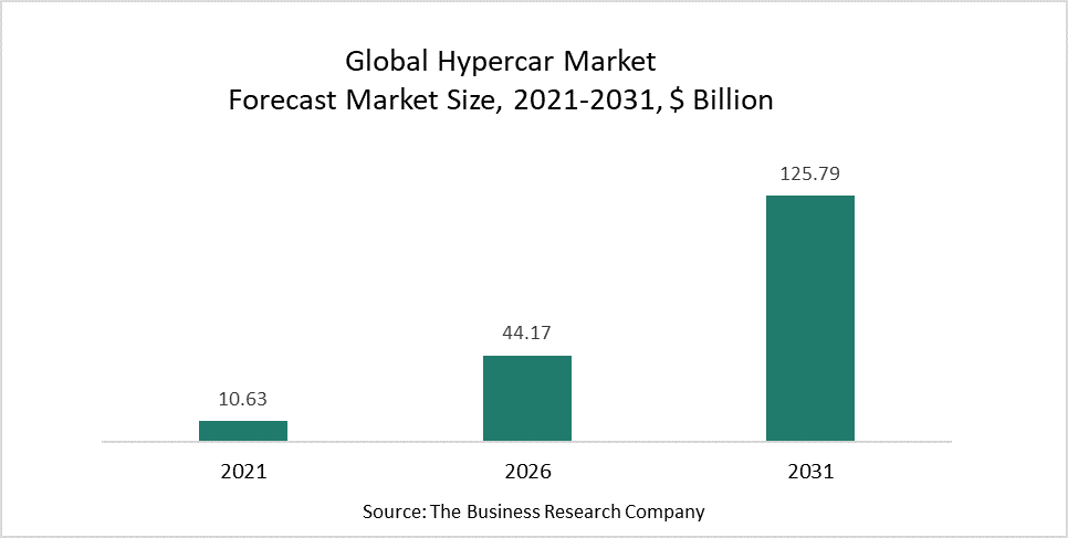The global hypercar market size is expected to grow from $10.63 billion in 2021 to $44.17 billion in 2026 at a rate of 33.0%. The global hypercar market share is then expected to grow at a CAGR of 23.3% from 2026 and reach $125.79 billion in 2031.
