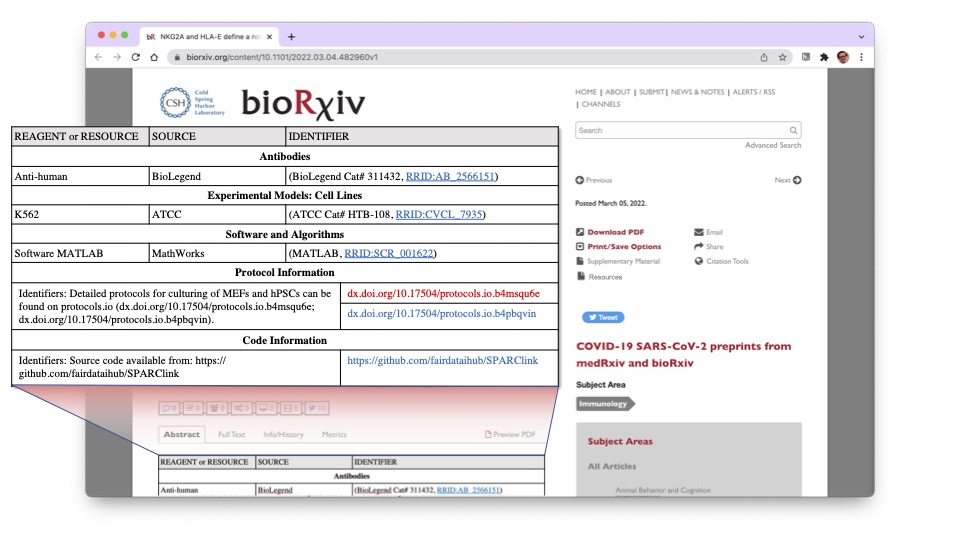 SAN DIEGO, CA, USA, November 8, 2022 /EINPresswire.com/ — In scientific studies, key research resources such as antibodies are underspecified by authors, making it unclear which resource was used in a study (Vasilevsky et al, 2013). When key reagents are not well specified, the study is not reproducible.Irreproducibility is due to underspecified resources, and is a lingering problem with a significant economic impact (Freedman et al., 2015). One of the most complete solutions to this problem is the Key Resources table, part of the STAR Methods framework developed in Cell Press. This table, compiled by the authors, makes it very predictable and thus easy to find resources used in the study. These resources have been historically available in Cell Press journals. We have an opportunity to bring them to preprints using semi-automated methods.