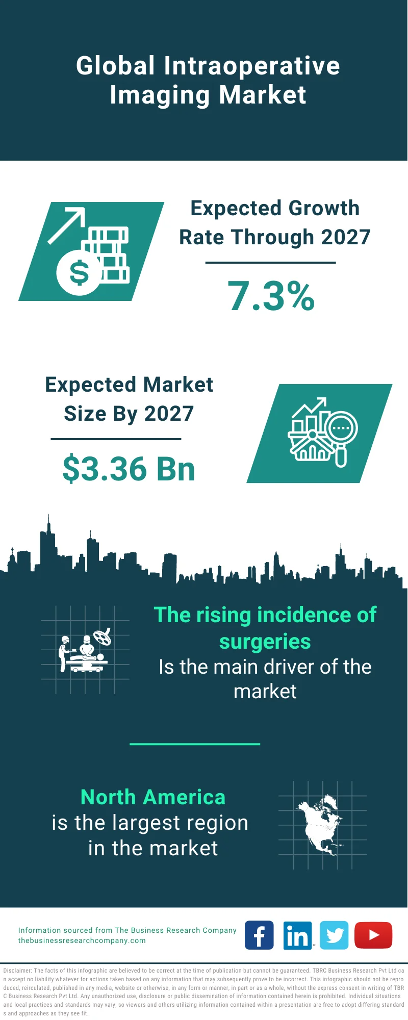 The growth in the intraoperative imaging market is due to the rising incidence of surgeries. North America region is expected to hold the largest intraoperative imaging market share. Major players in the intraoperative imaging market include Canon Medical Systems Corporation, Carl Zeiss Meditec AG, Esaote SpA, Fujifilm Holdings Corporation, General Electric Company.