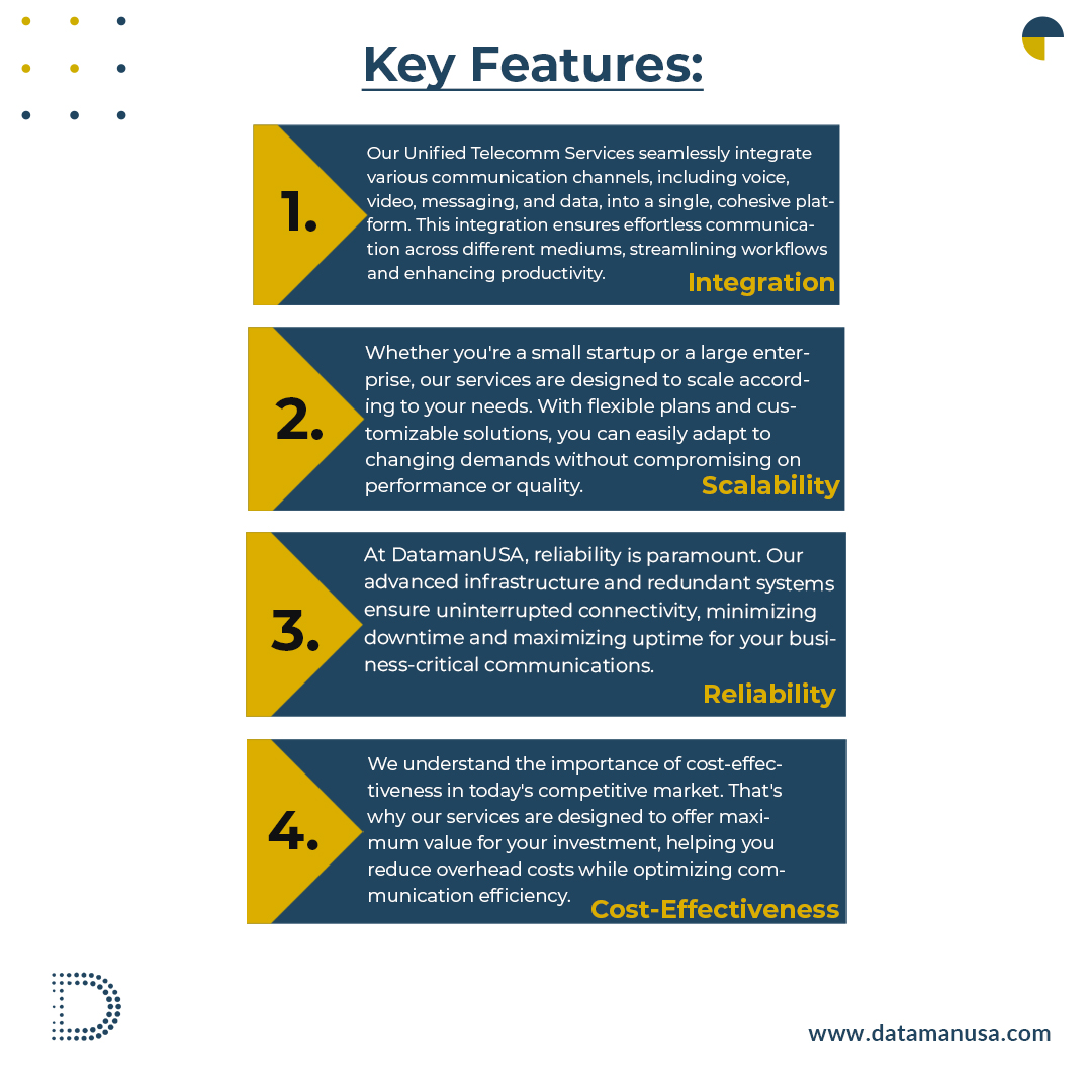 1. Integration: DatamanUSA’s Unified Telecomm Services seamlessly integrate various communication channels, including voice, video, messaging, and data, into a single, cohesive platform. This integration ensures effortless communication across different mediums, streamlining workflows and enhancing productivity.
