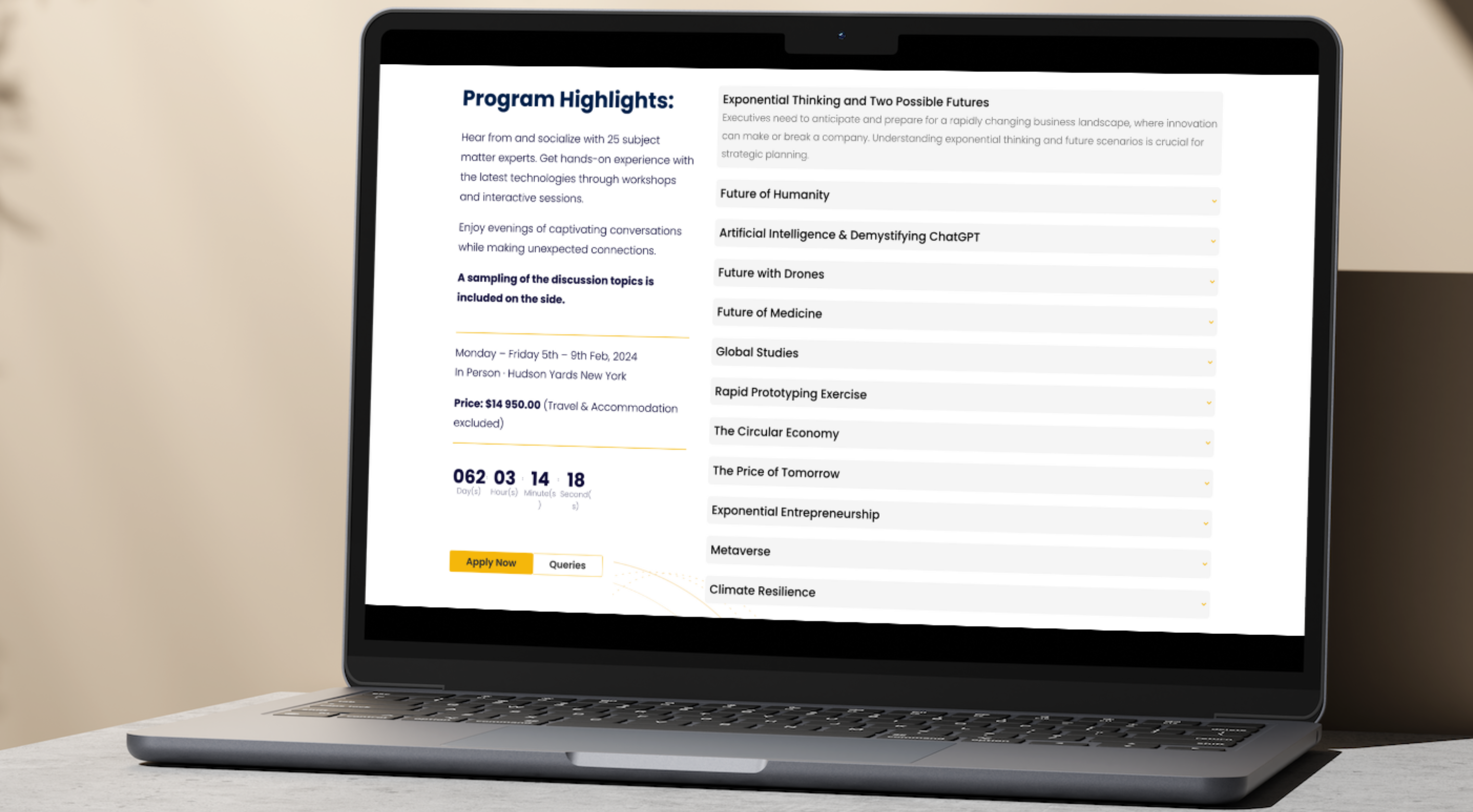 Over an intensive five-day program, participants will delve deep into the Exponential Organization framework, gaining insights to master these groundbreaking concepts. The program not only equips leaders with the necessary tools to adapt to uncertainty but also empowers them to chart a course for personal and organizational advancement.