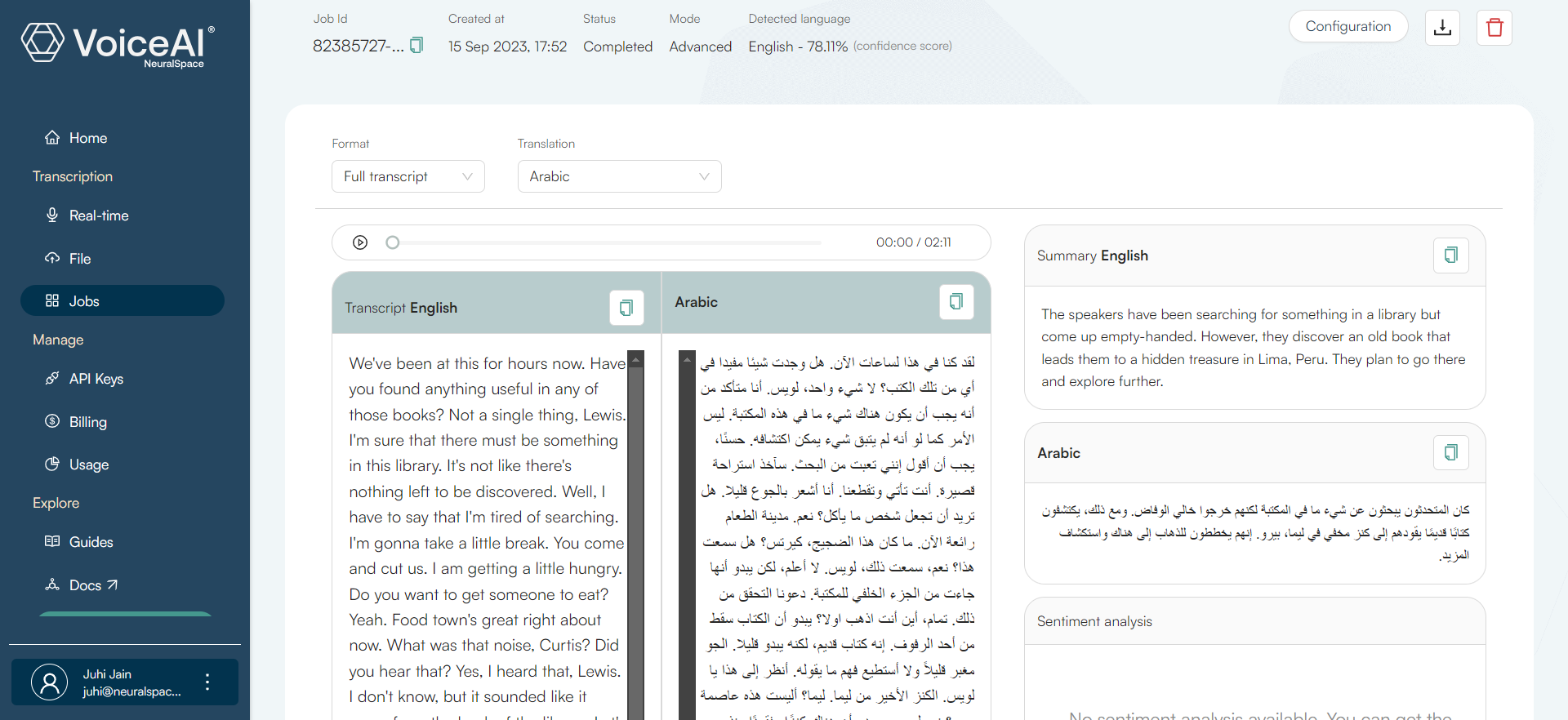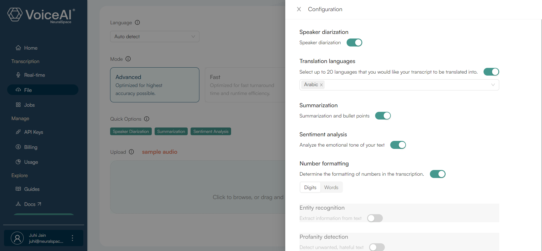 The VoiceAI platform enables companies to transcribe, translate and analyze any audio data. With dual transcription capabilities, users can upload audio files or opt for real-time transcription, capturing live speech with instant results.
