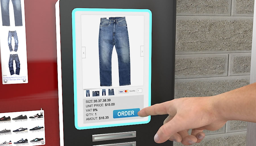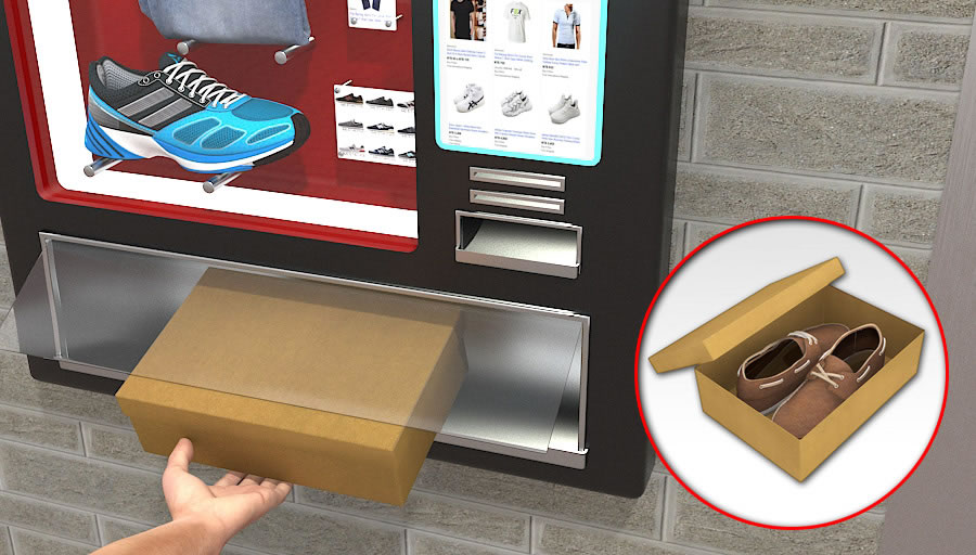 There can be several touchscreen menus to select and purchase items with a cash or credit card. Each item can be stored in boxes and distributed to the buyer once payment is made. The exterior can be constructed using a hard, durable material to support three touchscreen menus. Machines can have their items swapped out to accommodate different seasonal events, special sales, and much more.