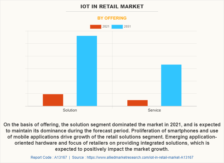 By offering, the solutions segment dominated growth of the Internet of Things in retail market in 2021, and is expected to maintain its dominance in the upcoming years. The proliferation of smartphones and the use of mobile applications are driving the growth of the retail solutions segment. Emerging application-oriented hardware and retailers’ focus on providing integrated solutions is expected to positively impact segment growth.