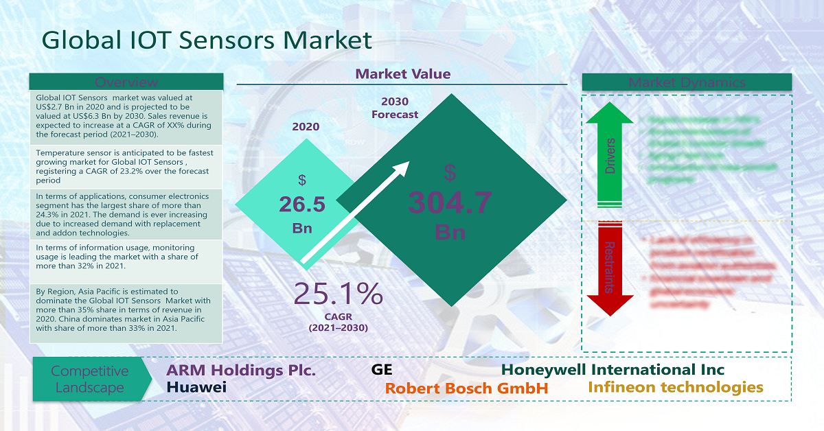The ‘Global Internet of Things (IoT) Sensors Market’ was valued $26.5 bn in 2020 and is expected to reach $304.7 bn at the CAGR of 25.1% between 2021 and 2031.