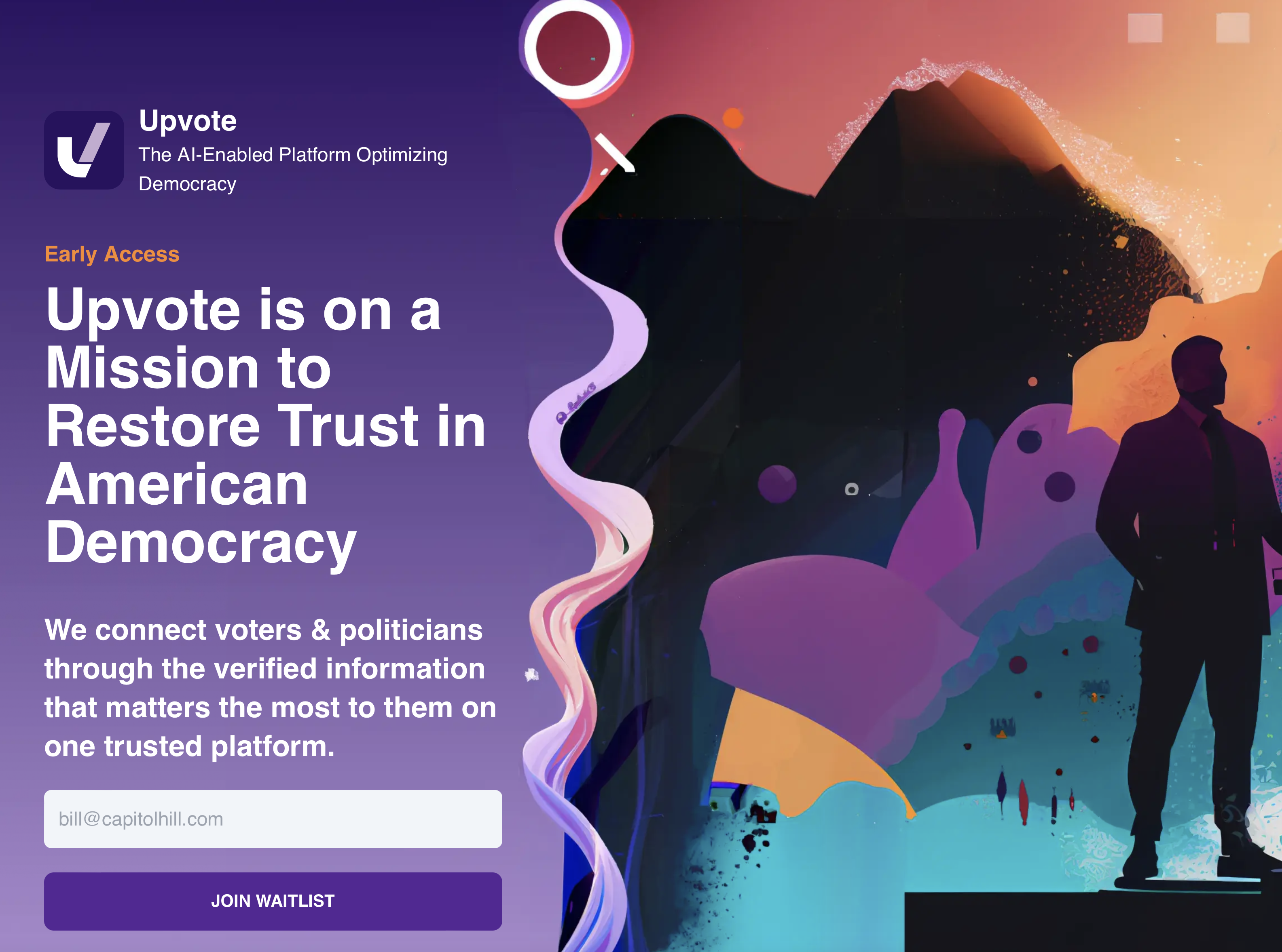 Upvote is looking to tackle the problems of political communications by making verified information available at scale. This allows the average voter to compete directly with special interests, filters out misinformation, and empowers voters to influence political outcomes. If UpVotes’ ease of use leads more moderates to engage in politics, it may diminish the influence of ideologues who currently participate at higher rates.