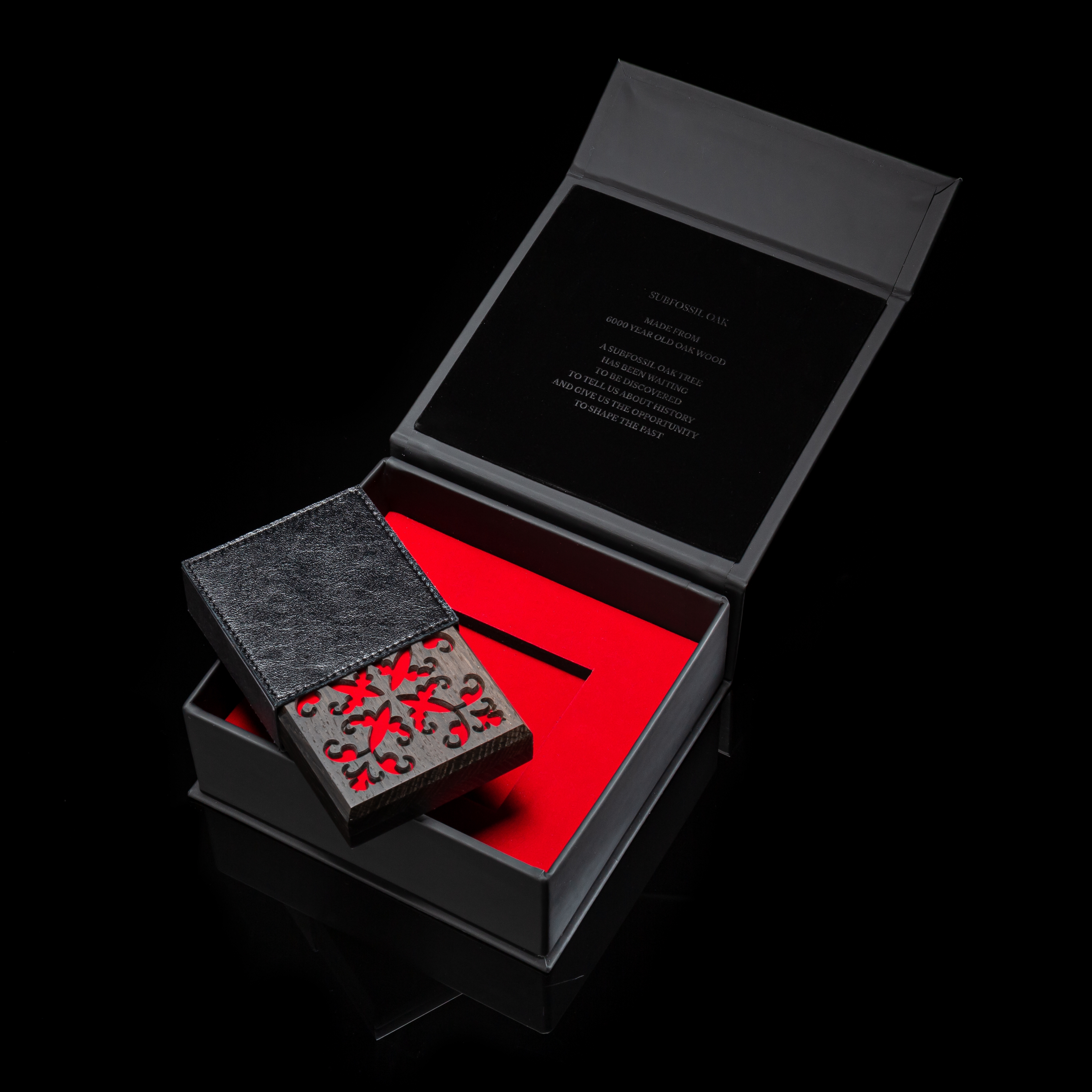 The luxury boxes are made from the wood of 6500 years old oak trees. It is a completely unique material two times older than the Egyptian pyramids, a relic of the Ice Age. These pieces of trees have seen mammoths and other long-extinct animals This age is verified by carbon analysis at Beta Analytic Laboratory in Miami, Florida. Subfossil Oak is the only company in the world licensed to harvest such wood. It takes it from a depth of 5-6 metres in South Moravia (the Czech Republic).