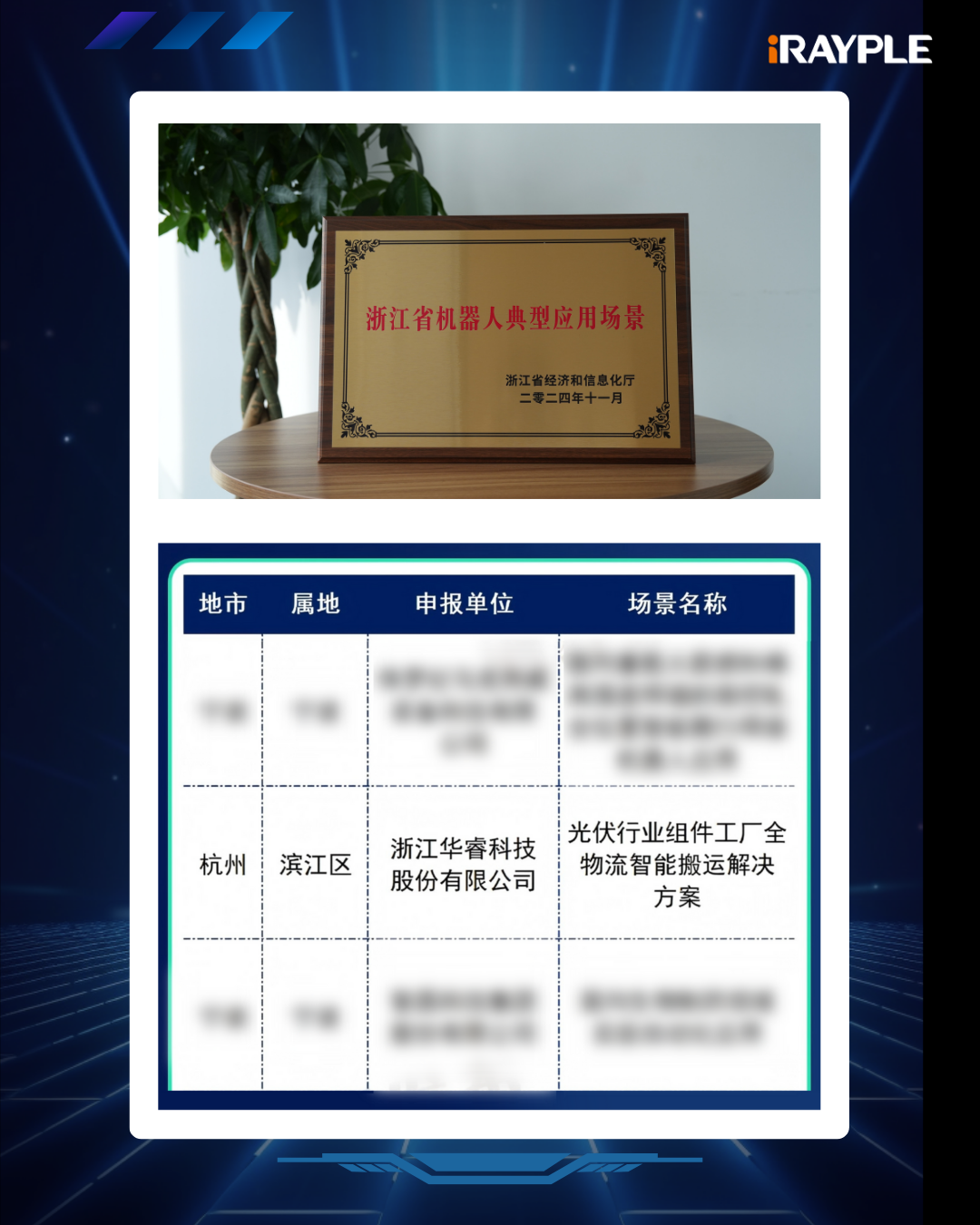 iRAYPLE’s Comprehensive Smart Logistics Solution for Photovoltaic Module Manufacturing was recognized as a Typical Robotics Application Scenario, while iRAYPLE itself was named a Benchmark Enterprise for Robotics+ Applications by the Zhejiang Provincial Department of Economy and Information Technology.