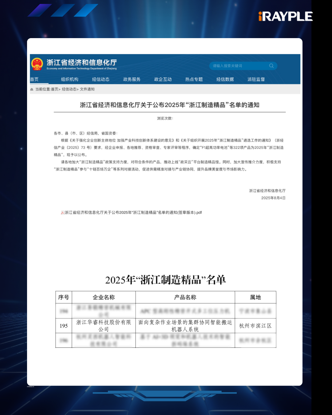 In addition, iRAYPLE earned a place on the 2025 “Zhejiang Manufacturing Excellence” list after passing rigorous enterprise application, expert review, and qualification assessments.