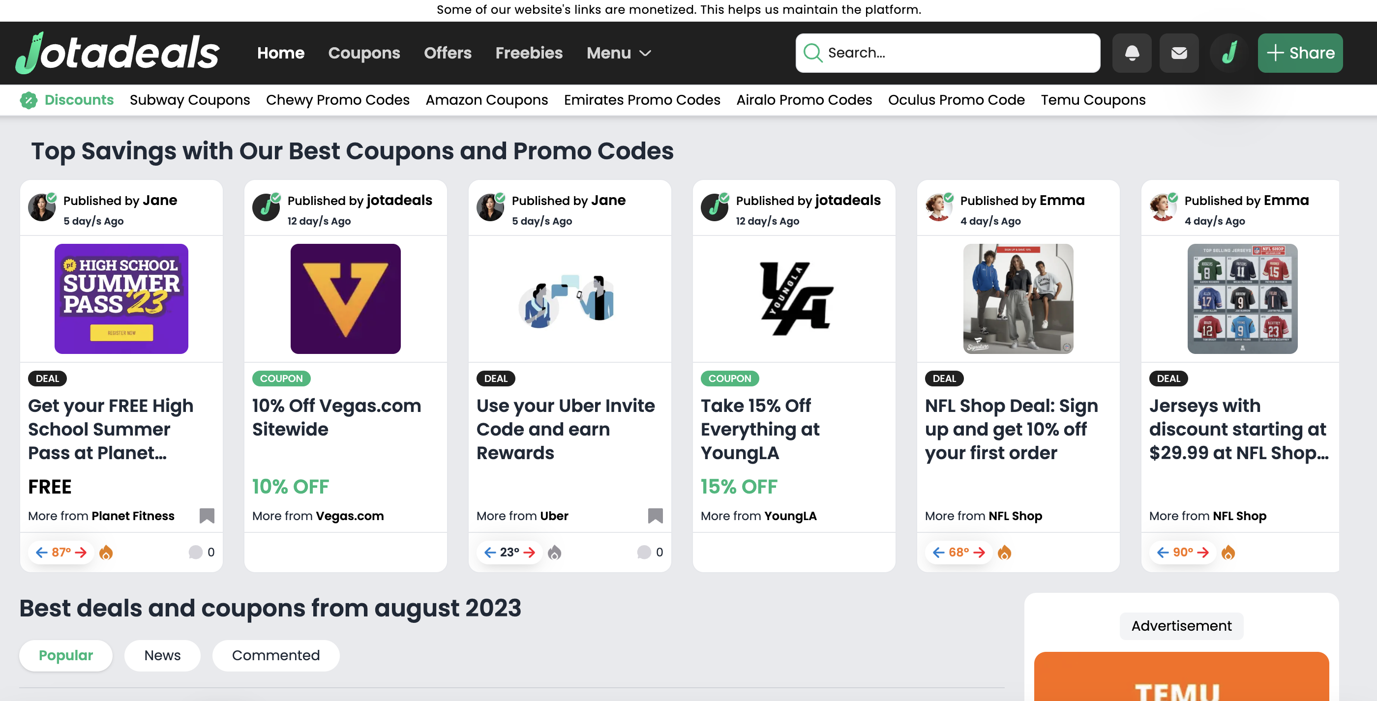 USA, August 15, 2023/EINPresswire.com/ — JotaDeals.com, a recent entrant into the U.S. e-commerce landscape, brings forth an innovative platform designed around a virtual cashback system. Distinctively, it functions as a social network focused on coupons and deals.