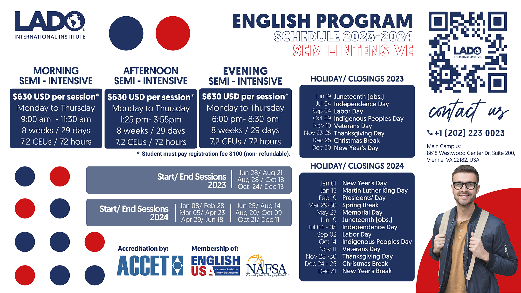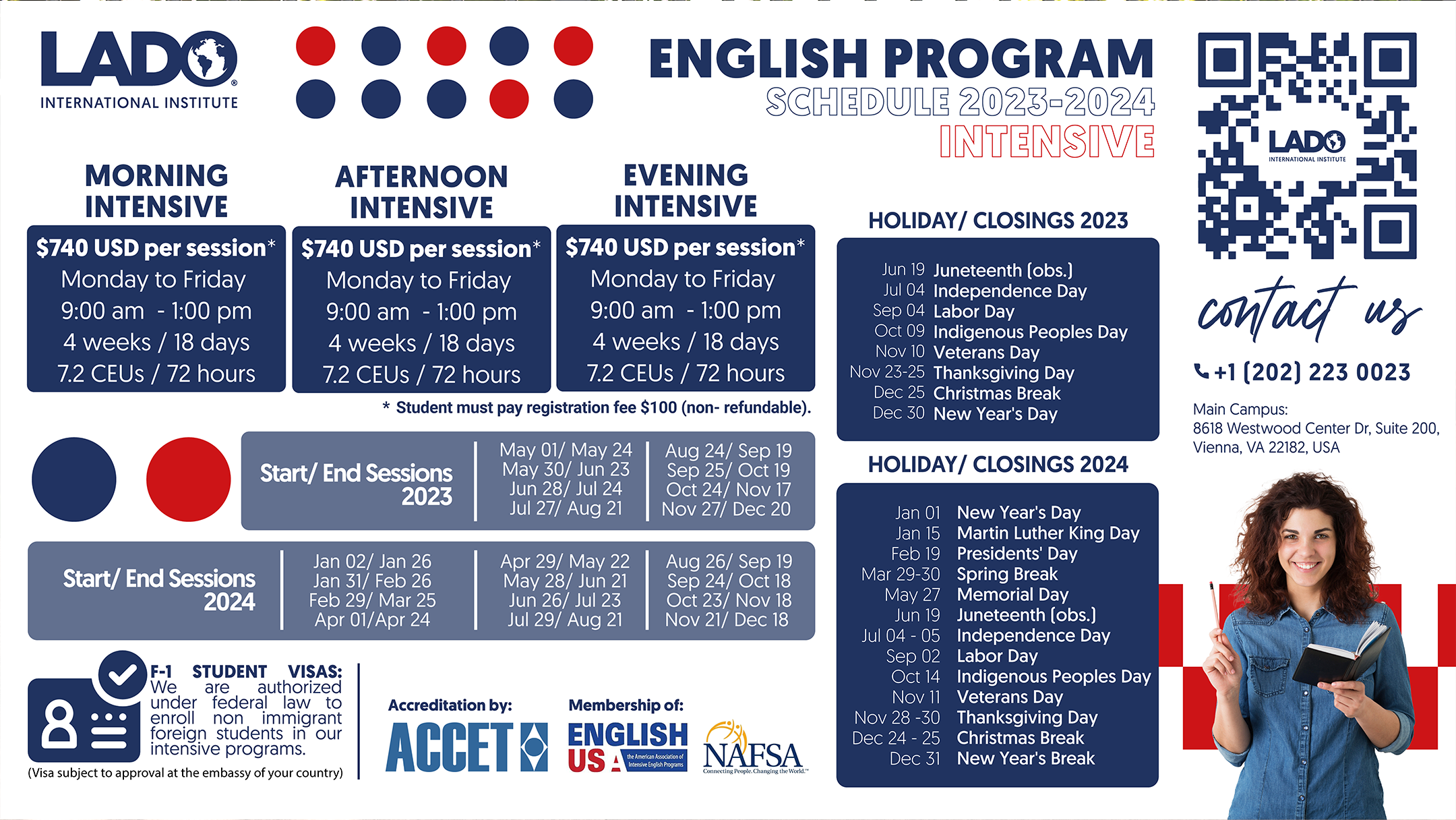 O LADO International Institute fica há poucos quilômetros da Casa Branca, o principal ponto da capital norte-americana. Há apenas dois meses no novo endereço, que fica no condado de Vienna, na Virgínia, a escola LADO conta com moderna estrutura com 20 salas de aula climatizadas, professores experientes, equipe preparada para apoiar os alunos e um lounge para os estudantes. A nova sede tem localização privilegiada estando próxima de estação de metrô, restaurantes e supermercados.