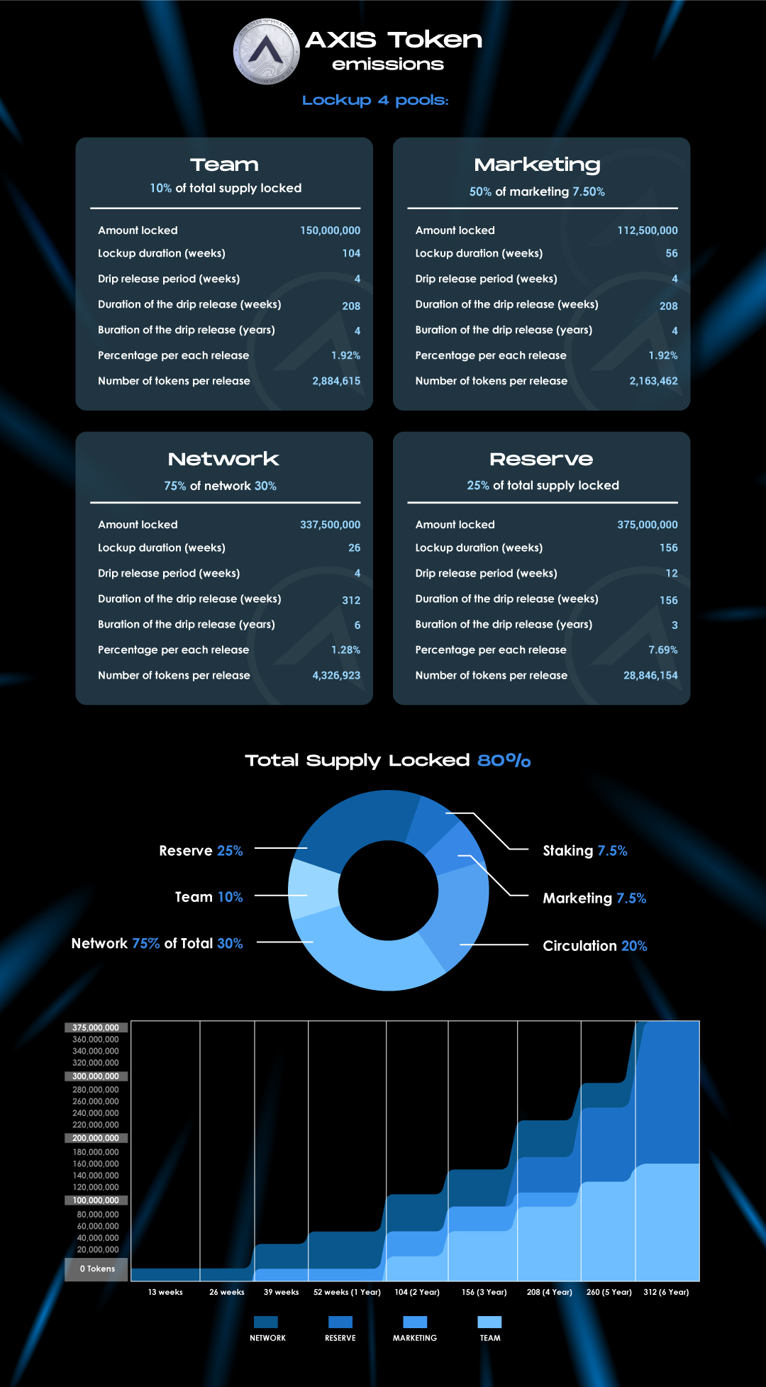 Holders of the AXIS token can stake their tokens for a set period of time in order to realize yields from their investment. The remaining 20% will be liquid tokens available for users to trade with and utilize on the platform.