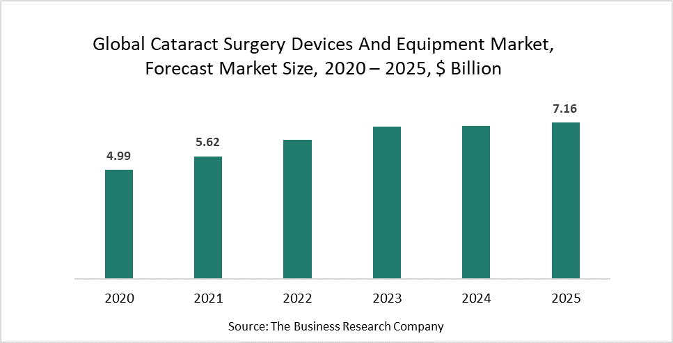 The global cataract surgery devices market size is expected to grow from $4.99 billion in 2020 to $5.62 billion in 2021 at a compound annual growth rate (CAGR) of 12.6%. The growth is mainly due to the companies rearranging their operations and recovering from the COVID-19 impact, which had earlier led to restrictive containment measures involving social distancing, remote working, and the closure of commercial activities that resulted in operational challenges. The market is expected to reach $7.16 billion in 2025 at a CAGR of 6.2%.