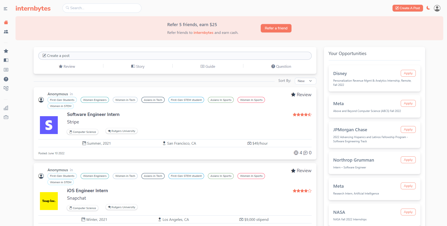 InternBytes’ website allows users to post anonymous reviews about their internships, broadening the search capabilities of students looking to advance or kick start their careers. The reviews are formatted to provide valuable information equipping internship seekers with the details they need to make the best decisions possible about potential positions. InternBytes is a vast repository of opportunities in many industries.