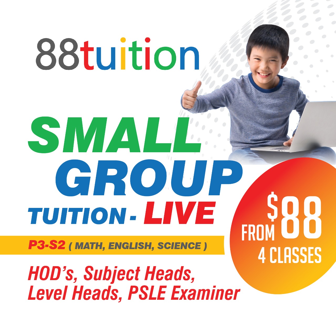 The tutorial classes are conducted for the students of P3-S2, and the classes are only for English, Maths and Science. 88tuition adheres to the MOE curriculum and is best suited for students in the MOE system.