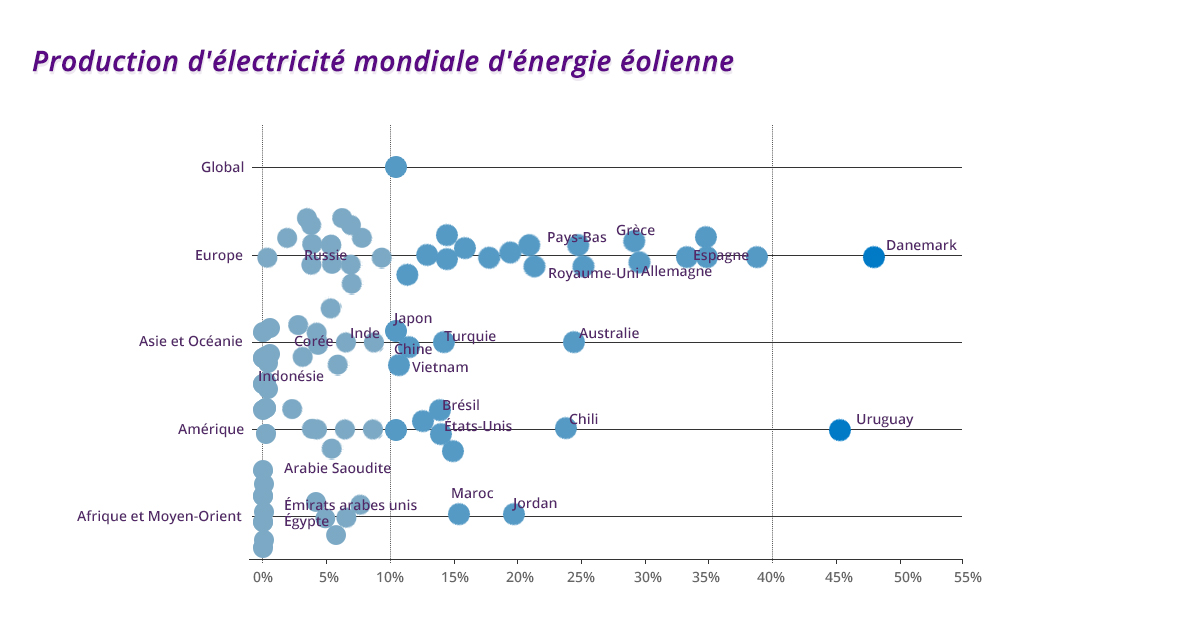 Dans le monde, 50 pays ont franchi la barre des 10 % d’énergie éolienne et solaire, dont sept nouveaux pays : la Chine, le Japon, la Mongolie, le Vietnam, l’Argentine, la Hongrie et le Salvador.