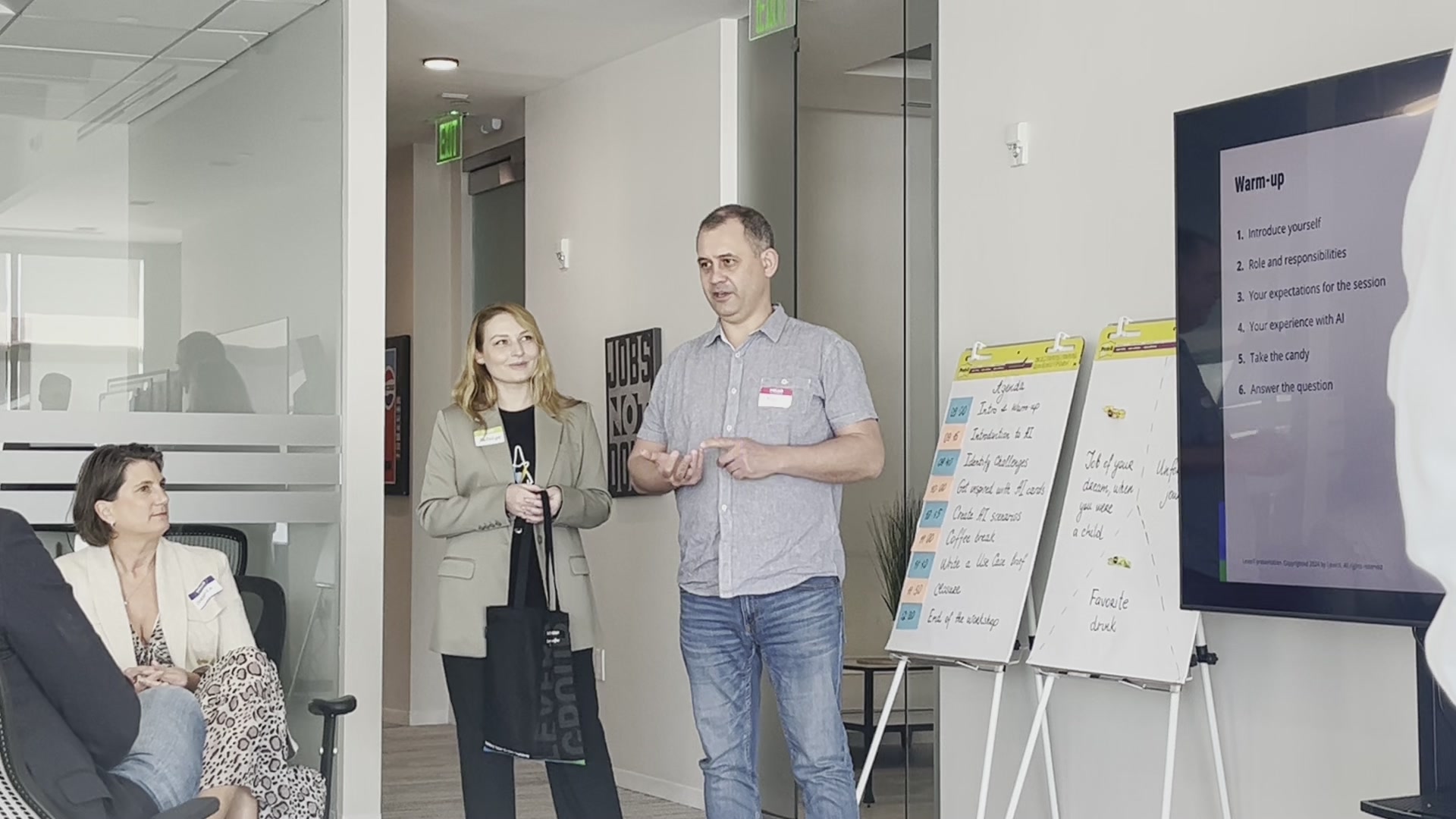Following this enlightening discussion, the LeoTronics team engaged in the Design Thinking Workshop on February 14, titled “Empowering your Business with AI Capabilities.” Held at LeverX Miami headquarters, the workshop focused on employing AI to solve existing business problems through interactive group activities and expert insights. Coaches Nataliya Rubakhava, Dmitry Novik, and Siarhei Valenda led the session, providing participants with tools such as opportunity cards to stimulate brainstorming and innovative problem-solving. The workshop offered a perfect complement to the substantive discussions of the previous day, allowing attendees to apply theoretical knowledge in practical, real-world scenarios.