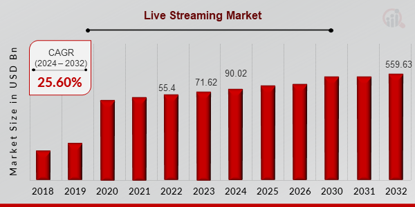 According to a new report published by Market Research Future (MRFR), Live Streaming Market is projected to grow from USD 90.01 Billion in 2024 to USD 559.63 Billion by 2032, exhibiting a compound annual growth rate (CAGR) of 25.60% during the forecast period 2024 – 2032.