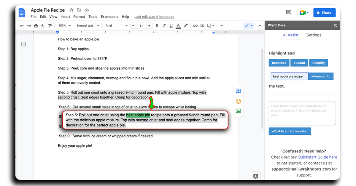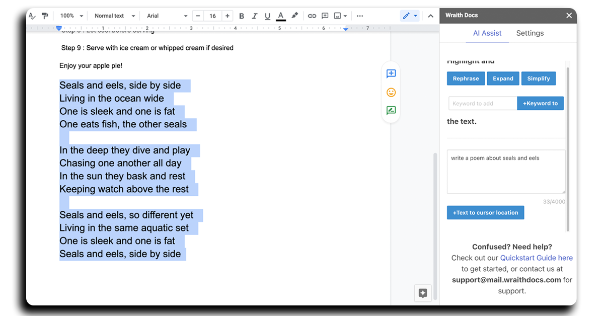 Make better content faster with Wraith Docs, a Google Docs assistant. Add any text you want, improve SEO, paraphrase, expand, and simplify text in a click.