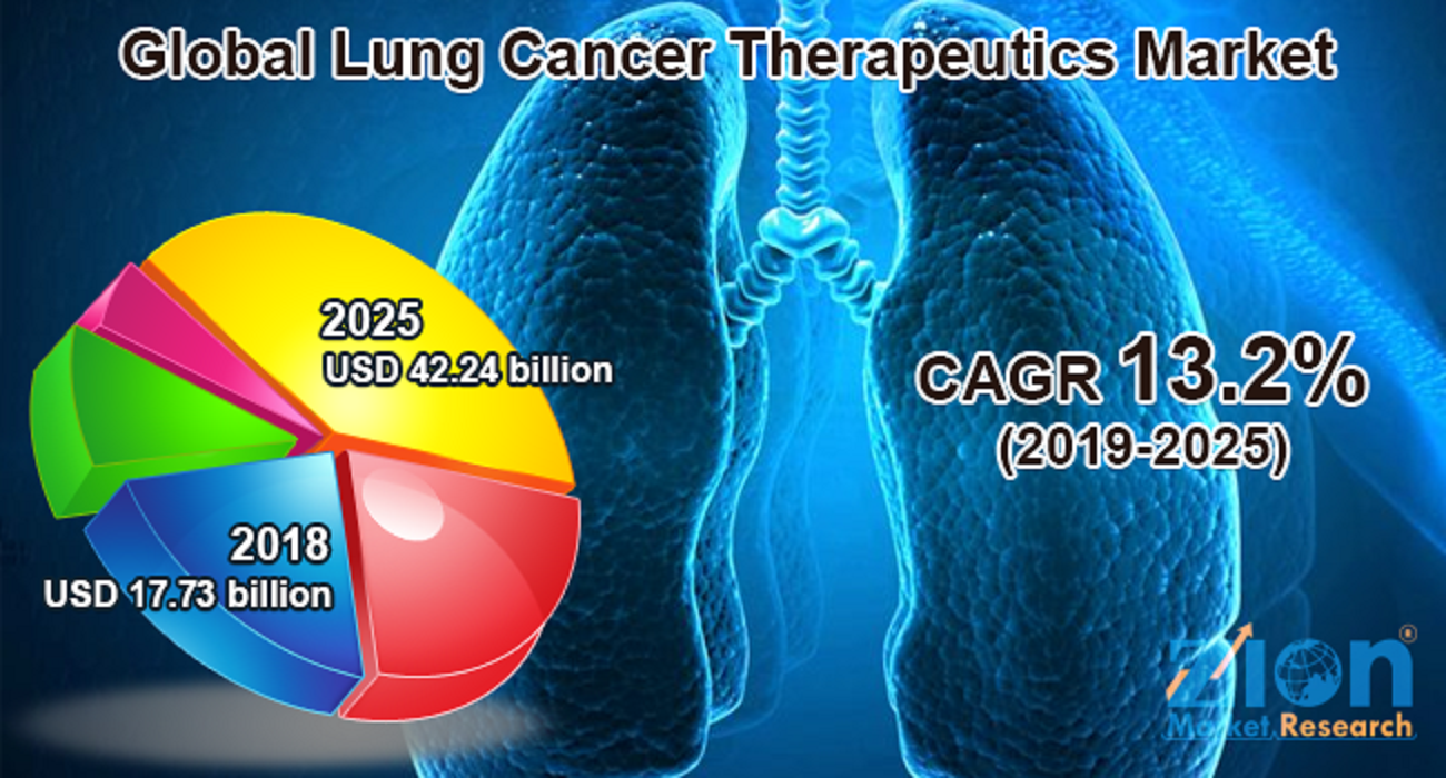 SUITE N202, FLORIDA, UNITED STATES, September 12, 2022 /EINPresswire.com/ — Zion Market Research has published a new report titled Lung Cancer Therapeutics Market By Cancer Type (Non-Small Cell Lung Cancer and Small Cell Lung Cancer), By Treatment (Immunotherapy, Chemotherapy, Targeted Therapy, Radiation Therapy, and Others), By Drug Class (Antimetabolites, Alkylating Agents, Mitotic Inhibitors, EGFR Inhibitors, Multikinase Inhibitors, and Others), By End-User (Hospitals, Homecare, Specialty Clinics, and Others), and By Distribution Channel (Retail Pharmacy, Hospital Pharmacy, Internet, and Others): Global Industry Perspective, Comprehensive Analysis, and Forecast, 2018–2025. According to the report, the global lung cancer therapeutics market was valued at USD 17.73 billion in 2018 and is expected to generate around USD 42.24 billion by 2025, growing at a CAGR of around 13.2% between 2019 and 2025.