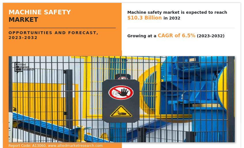 The demand for Machine Safety Market in different sectors is estimated to expand at a rapid pace during the forecast period, projects latest research report published by Allied Market Research. The report offers a detailed analysis of changing market trends, top segments, key investment pockets, value chains, regional landscapes, and competitive scenarios in global Machine Safety Market over 2021-2032. The global machine safety market was valued at $5.5 billion in 2022, and is projected to reach $10.3 billion by 2032, growing at a CAGR of 6.5% from 2023 to 2032.