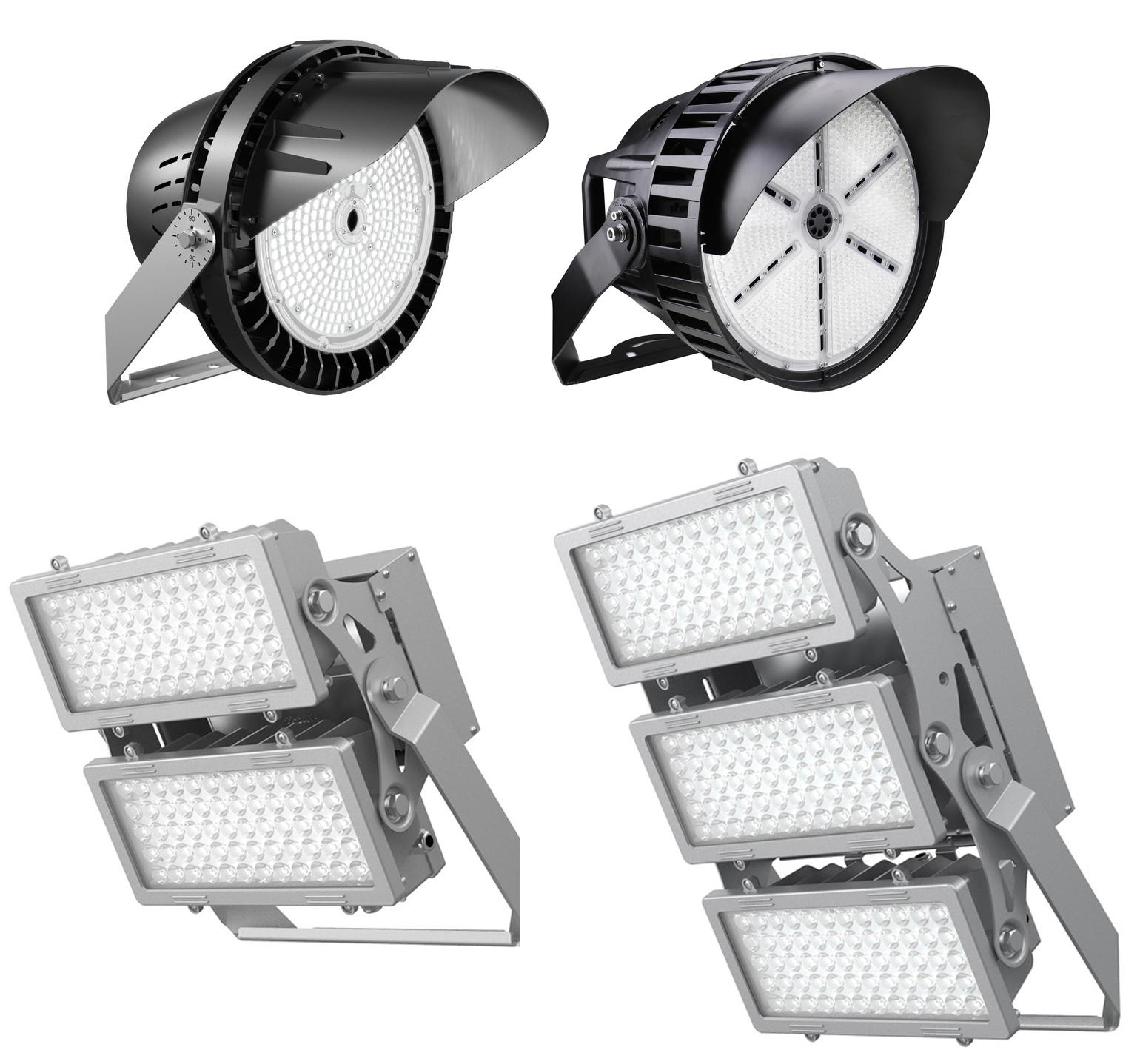 1000bulbs offers multiple varieties of sports lights to make sure you find one that suits your application and general preferences. Our round sports lights with black housing include visor shields that prevent spill lighting. They include a dimmable power supply of 0-10V and replace up to 2500-watt metal halides depending on the fixture. Square fixtures with silver housing feature two or three adjustable LED heads that can be individually aimed. Each silver fixture has either 0-10V dimming or 1-10V dimming and can replace 1700-watt MH fixtures. All fixtures are available in a variety of beam angle options and come with a yoke mount that allows you to aim the fixtures in the desired direction.