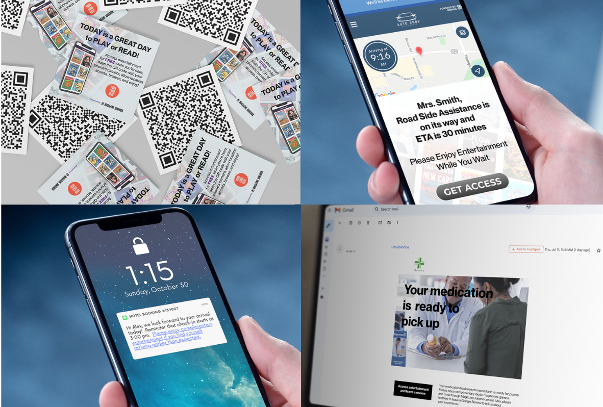 Magazine Jukebox QR Code stickers, phone showing auto app offering entertainment, phone showing text message offering entertainment, pharmacy email offering entertainment