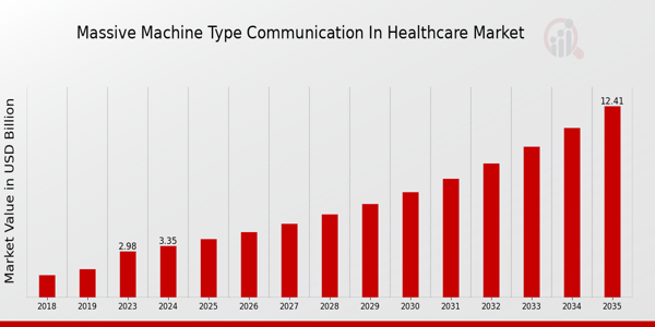 NEW YORK, NY, UNITED STATES, March 12, 2025 /EINPresswire.com/ — The Massive Machine Type Communication in the Healthcare Market Size was estimated at 2.98 (USD Billion) in 2023. The Massive Machine Type Communication in Healthcare Market is expected to grow from 3.35 (USD Billion) in 2024 to 12.4 (USD Billion) by 2035. The Massive Machine Type Communication in the Healthcare Market CAGR (growth rate) is expected to be around 12.63% during the forecast period (2025 – 2035).