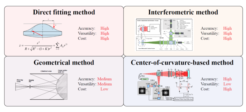 With the gradual maturity of aspheric surface measurement methods, the direct fitting method has been widely used in aspheric surface parameter measurement due to its high accuracy and versatility. And the interferometric method, geometrical method, and center-of-curvature-based method have different advantages in test accuracy, versatility, and cost control.