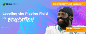 MIAMI, FLORIDA, USA, May 5, 2021 /EINPresswire.com/ — On Saturday, May 15th from Noon to 3:00 PM EDT, Miami EdTech will host a series of fireside chats and workshops to explore opportunities for students, teachers, and ALL stakeholders in education to learn about current initiatives and future opportunities to ensure a Level Playing Field in Education. Keynote Speaker Ricky Williams spent 11 seasons in the NFL after winning the Heisman Trophy as a student at the University of Texas. As CEO of a tech company, Ricky will share his entrepreneurial journey and experience transitioning from the football field into the world of computing and entrepreneurship.