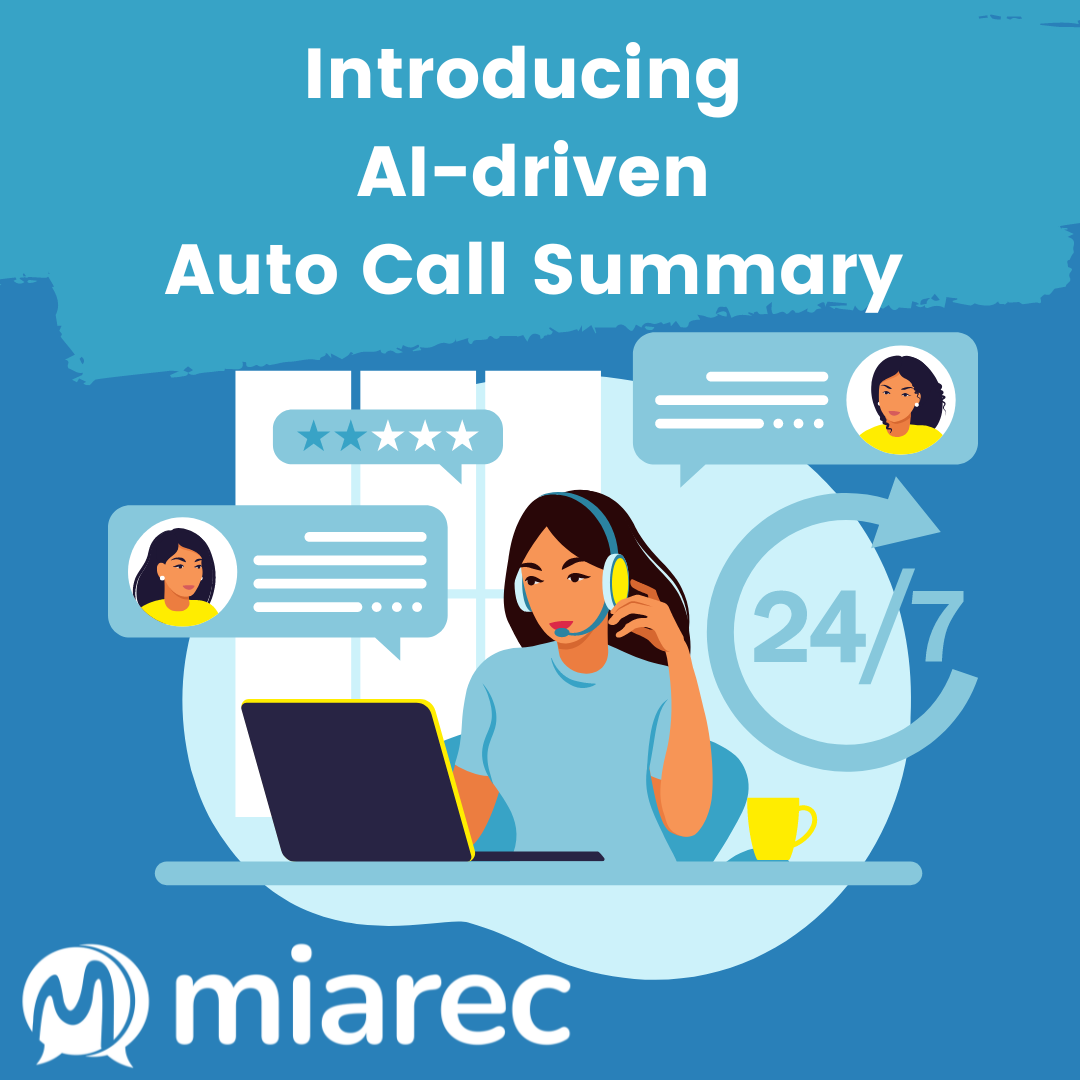 MiaRec Auto Call Summary will be a great addition to MiaRec’s already comprehensive portfolio of Conversation Intelligence solutions, which includes powerful features such as MiaRec Auto Data Redaction, Auto ScoreCard, Sentiment and Topical Analysis and much more. As part of MiaRec’s ongoing mission to eliminate manual processes and scale contact center workflows with AI, these features work together to optimize your contact center operations. Combine Auto Call Summary with our best-of-breed Voice Analytics and Automated Quality Management services to create better customer experiences for supervisors, agents, and customers alike.