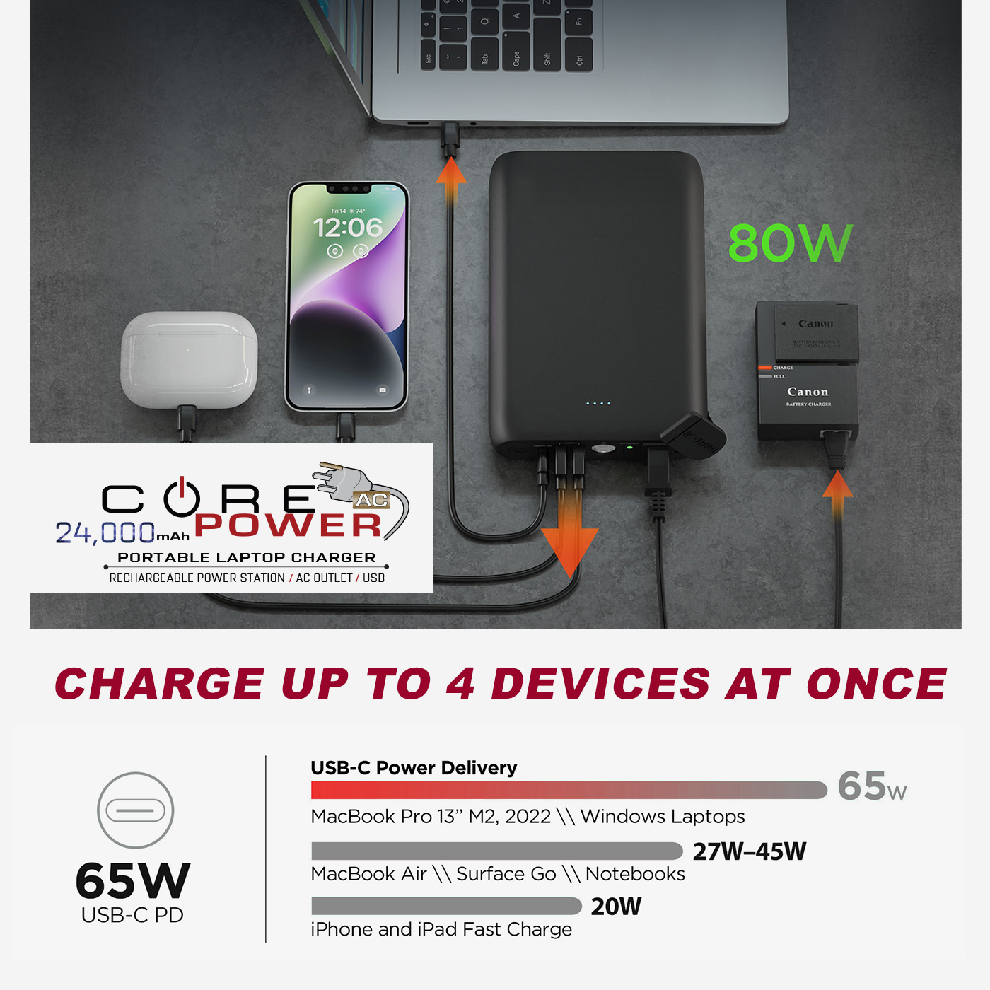 CORE Gaming’s powerful new 24000 mAh Capacity Power Brick is the perfect solution for mobile power needs. Compact and lightweight, this airplane-friendly device features four outputs, including a built-in AC outlet, and can recharge four devices simultaneously. At 24,000 mAh (88WH), it can double a laptop’s battery life or keep a smartphone charged for a week.