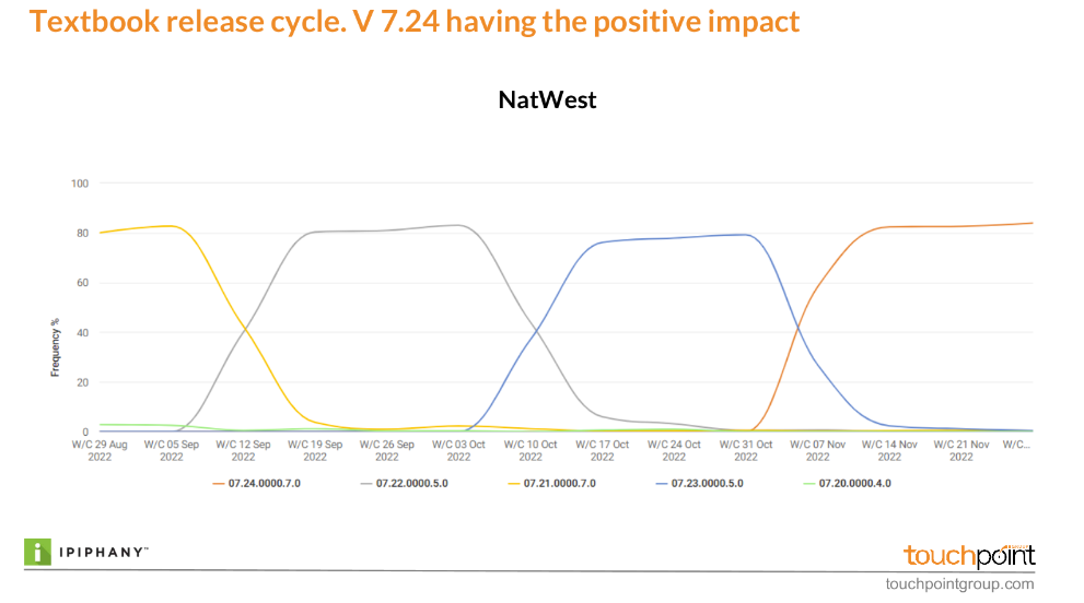 In what can only be described as a best practice approach to app version releases NatWest has been clinical in executing releases in the second half of 2022 and what was a consistent, gradual increase in positive customer feedback turned into a tsunami in November with the overall Engaged Customer Score rocketing from 4.00 to 5.55 out of a possible 5.00 in November.