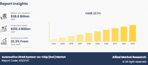 WILMINGTON, NEW CASTLE, DE, UNITED STATES, December 10, 2024 /EINPresswire.com/ — Allied Market Research published a report, titled, โAutomotive LiDAR system-on-chip (SoC) Market By technology type (mechanical LiDAR, and solid state LiDAR) By vehicle type (passenger vehicles, and commercial vehicles) By application (Adaptive Cruise Control (ACC) , Lane Keeping Assistance System (LKAS) , Traffic Jam Assist (TJA) , Automated Parking System (APS) , and others) : Global Opportunity Analysis and Industry Forecast, 2022-2032โ. The global automotive LiDAR system-on-chip (SoC) market were valued at $28.6 billion in 2023 and is estimated to reach $212.7 billion by 2033, exhibiting a CAGR of 22.3% from 2024 to 2033.