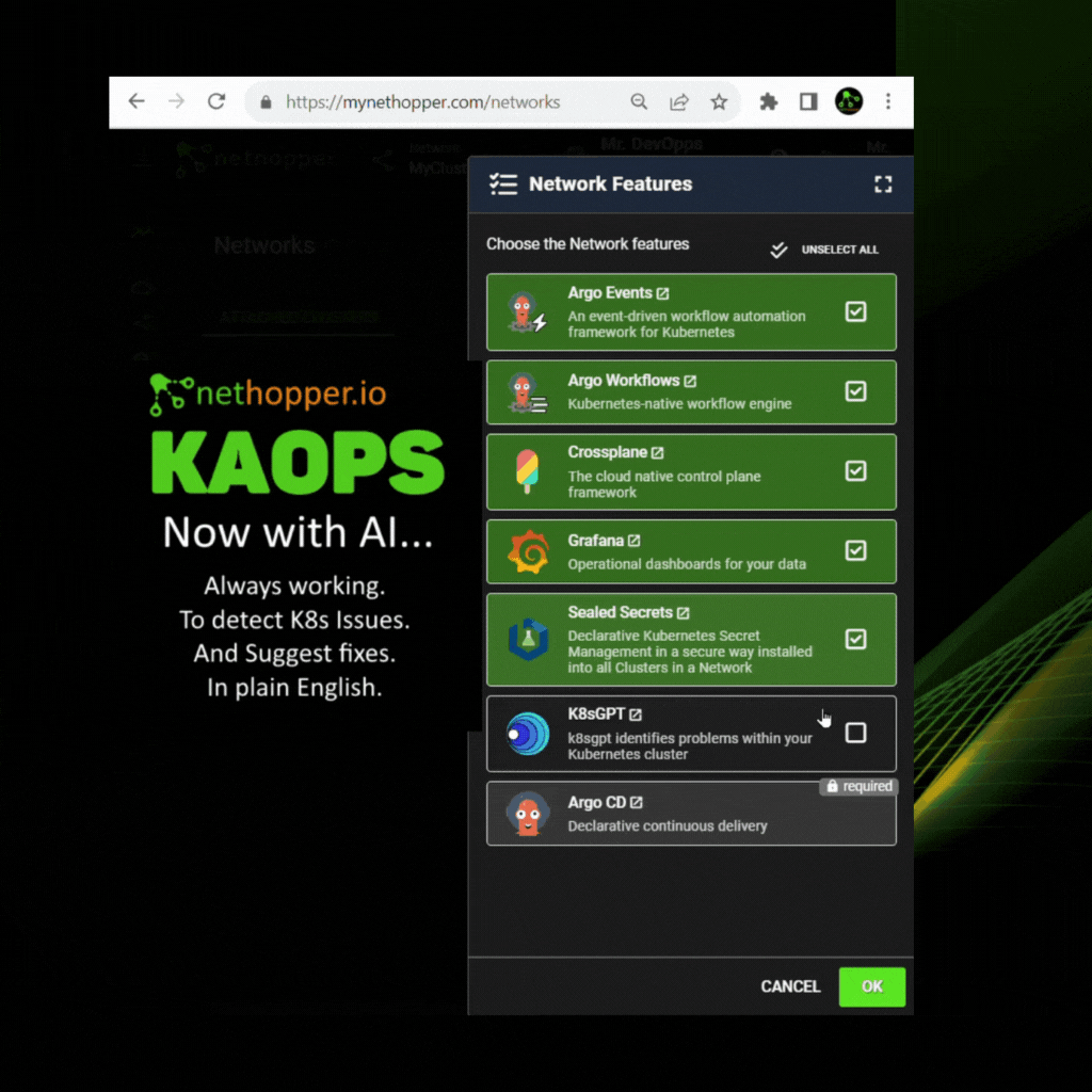 BOSTON, MA, UNITED STATES, August 14, 2023/EINPresswire.com/ — Nethopper, the pioneer of Kubernetes Application Operations Platform as a Service, today announced GPT-based AIOps capabilities to diagnose and triage issues faster in Kubernetes clusters, using simple language. Kubernetes is known for its complexity and the operational challenges that come with it. Powered by open-source K8sGPT AI Large Language Models (LLMs), KAOPS’ AIOps further advances and simplifies the operations of Kubernetes and software containers, driving speed, productivity, and more robust software applications–without additional headcount.