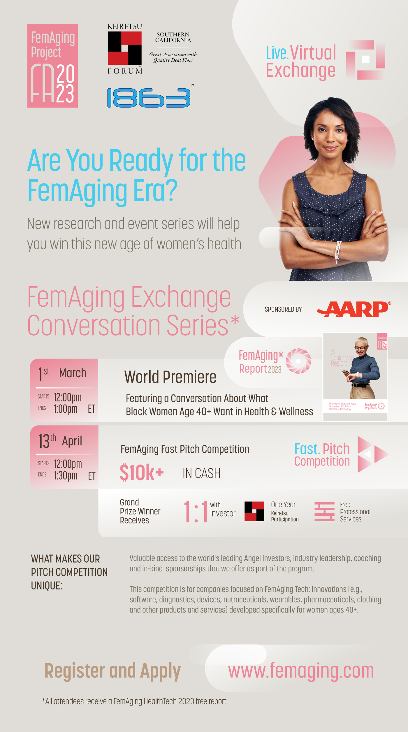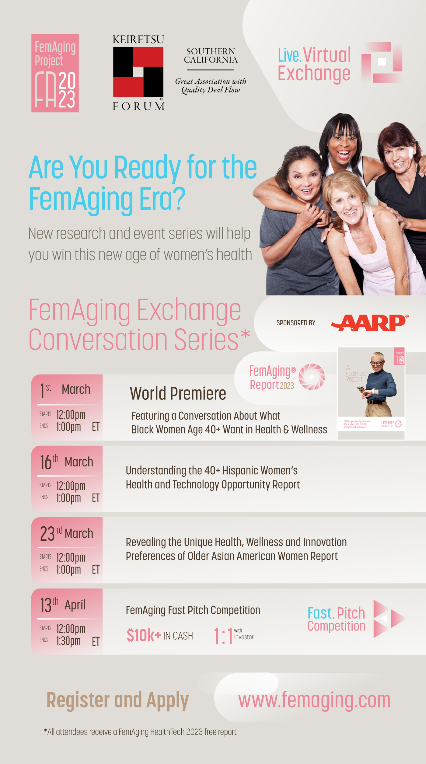 Beginning on March 1, the FemAging Project will hold the FemAging Exchange Conversation Series, three events focusing on its research and providing health, wellness, and innovation insights about women of color. On April 13, the Project will hold the Fast Pitch Competition, in partnership with Keiretsu Forum SoCal, which will feature FemAging innovators competing for cash and in-kind services. To learn more and register for the Conversation Series and pitch competition, visit www.femaging.com/femagingera.