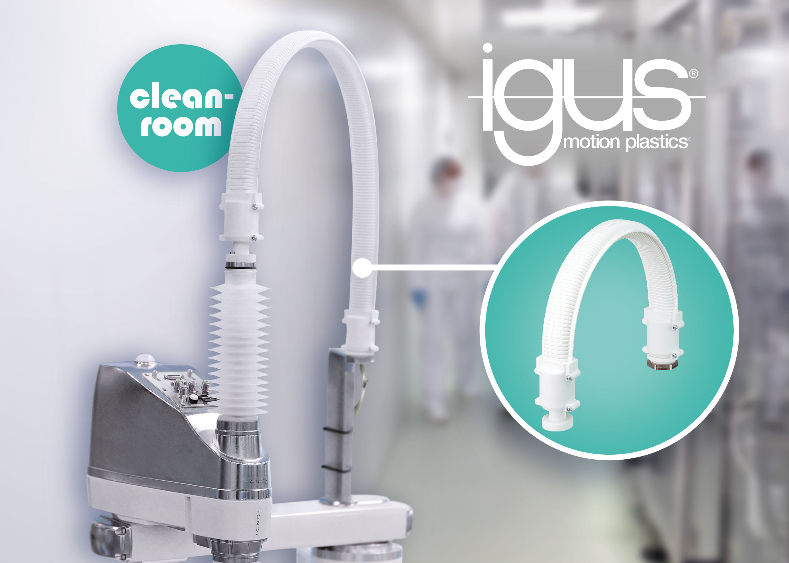 “Finding a way to guide cables and hoses on a SCARA robot in a cleanroom is a science in itself. Fast movements are pure stress for the material, which releases unwelcome abrasion particles,” says Matthias Meyer, Head of the triflex and Robotics Business Unit at igus.