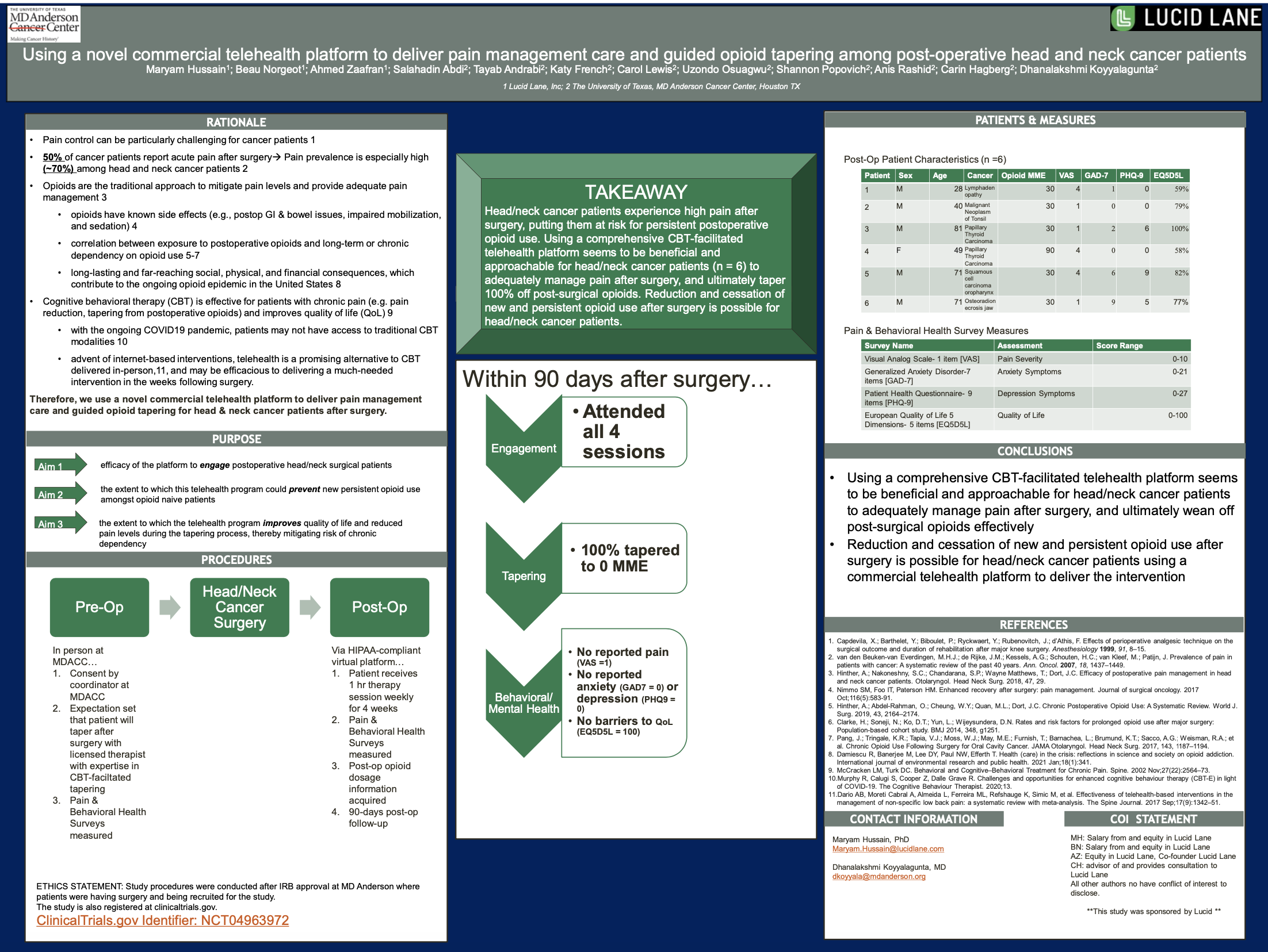 Conducted in conjunction with MD Anderson Cancer Center in Houston, this study had three aims: 1) evaluate the efficacy of Lucid Lane’s platform to engage postoperative head/neck surgical patients; 2) examine the extent to which this telehealth program could prevent new persistent opioid use amongst opioid naive patients; and 3) determine the extent to which the telehealth program improves quality of life and reduces pain levels during the tapering process, thereby mitigating risk of chronic dependency.