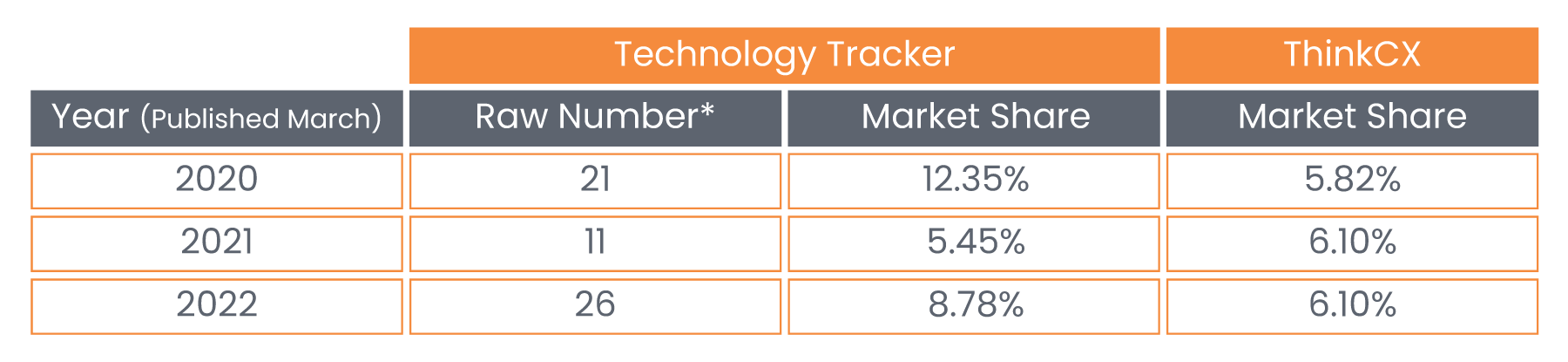 ThinkCX publishes much more consistent and credible regional market share numbers across time because its sample size is so much larger than Technology Tracker’s. ThinkCX’s analytical method identifies approximately 90% of UK broadband connections, which in survey terms would be comparable to running a technology poll 12 times a year and obtaining 24 million responses each time. This extraordinary representation rate enables ThinkCX to supply market intelligence analysts with highly credible share data, not only at the national level, but even more importantly for local and regional markets.