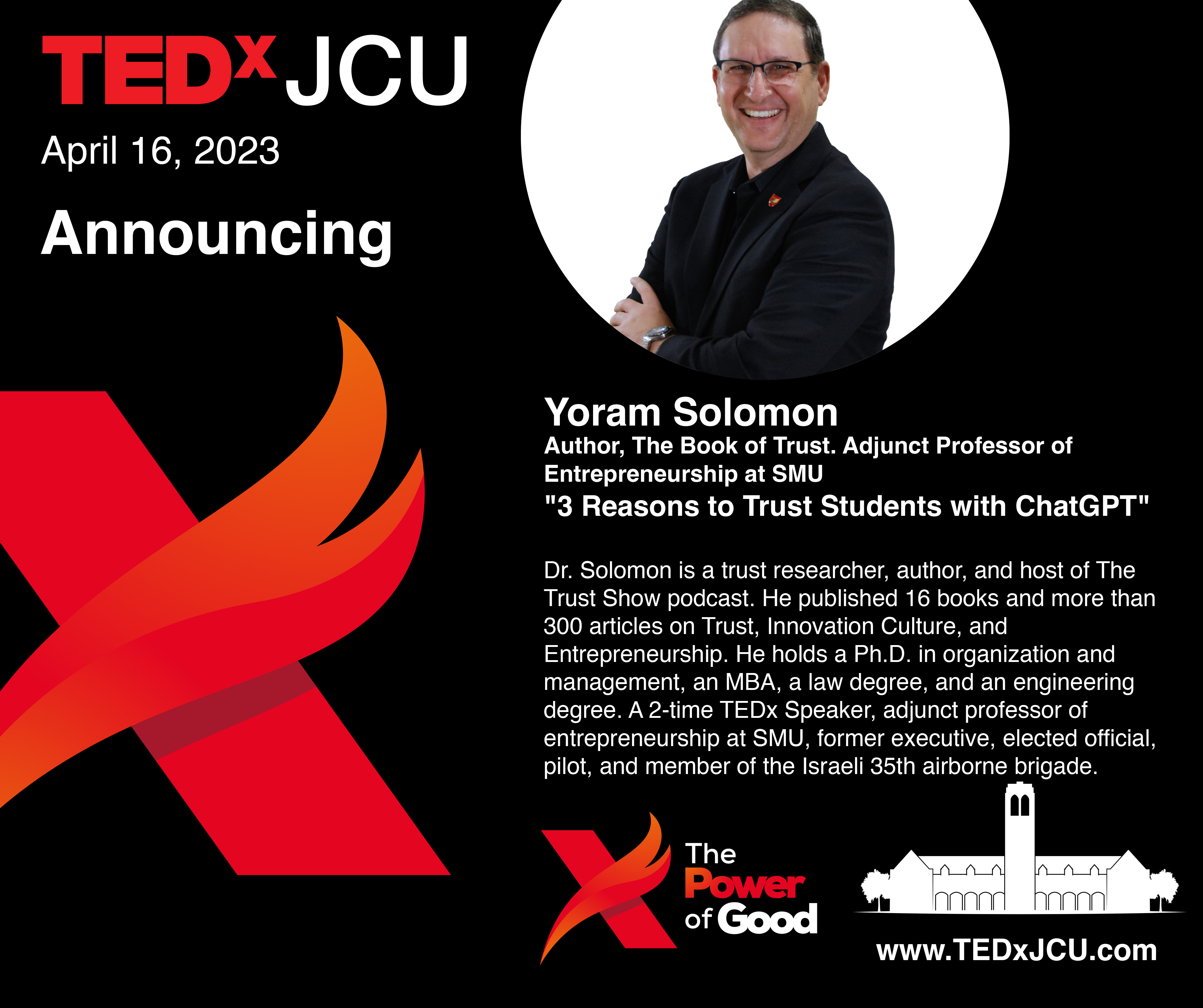 PLANO, TEXAS, USA, June 15, 2023/EINPresswire.com/ — Trust researcher and expert Dr. Yoram Solomon has released his third TEDx talk at TEDxJCU at John Carroll University. The 10-minute talk is available on the TED.com website and the YouTube TEDx channel.