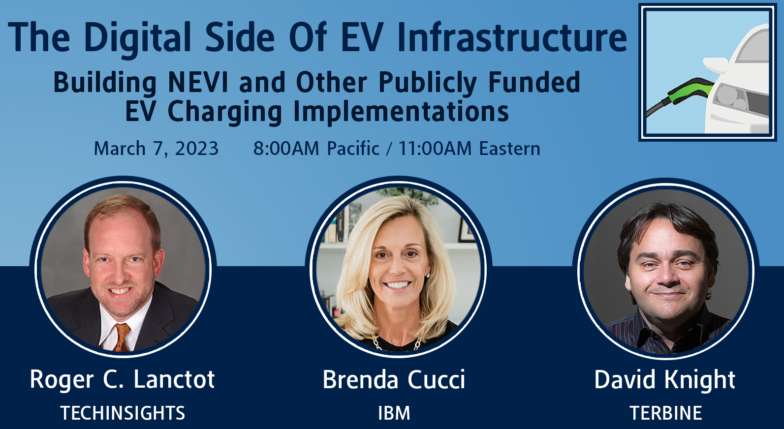 LAS VEGAS, NV, USA, February 22, 2023 /EINPresswire.com/ — A four-part webinar series intended to give state and local officials, engineering firms and contractors the education that they require to design, implement and operate EV charging networks that meet federal NEVI requirements kicks off on March 7th at 8AM Pacific / 11AM Eastern on Zoom Webinars. All sessions are one hour in length and free to attend. The first webinar, Building NEVI and Other Publicly Funded EV Charging Implementations, will cover how states can succeed in creating their charging networks under the National Electric Vehicle Infrastructure (NEVI) program that was authorized in 2022 under the federal Joint Office of Energy And Transportation. Featured presenters include well-known auto industry guru Roger C. Lanctot of TechInsights, Brenda Cucci of IBM and David Knight of Terbine.